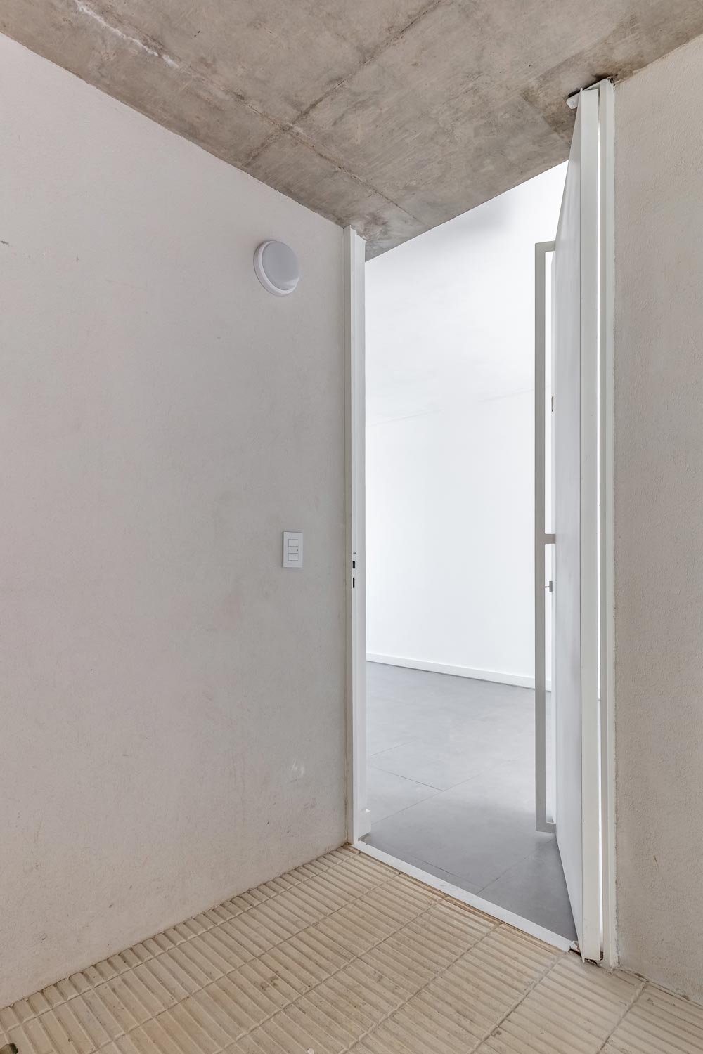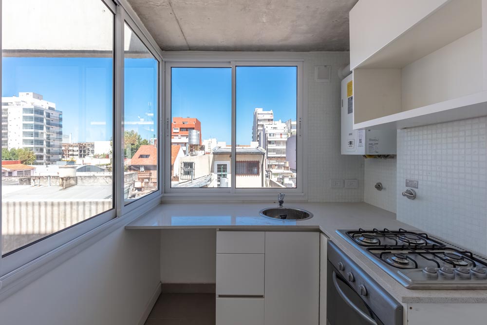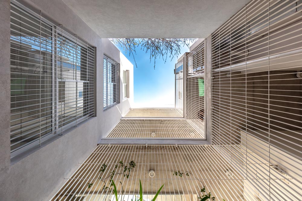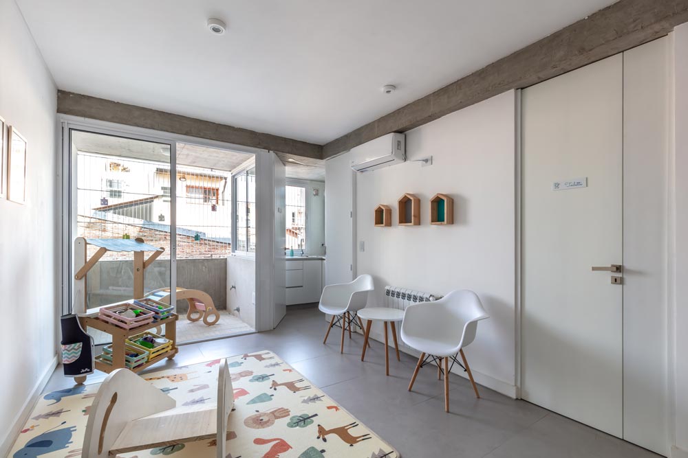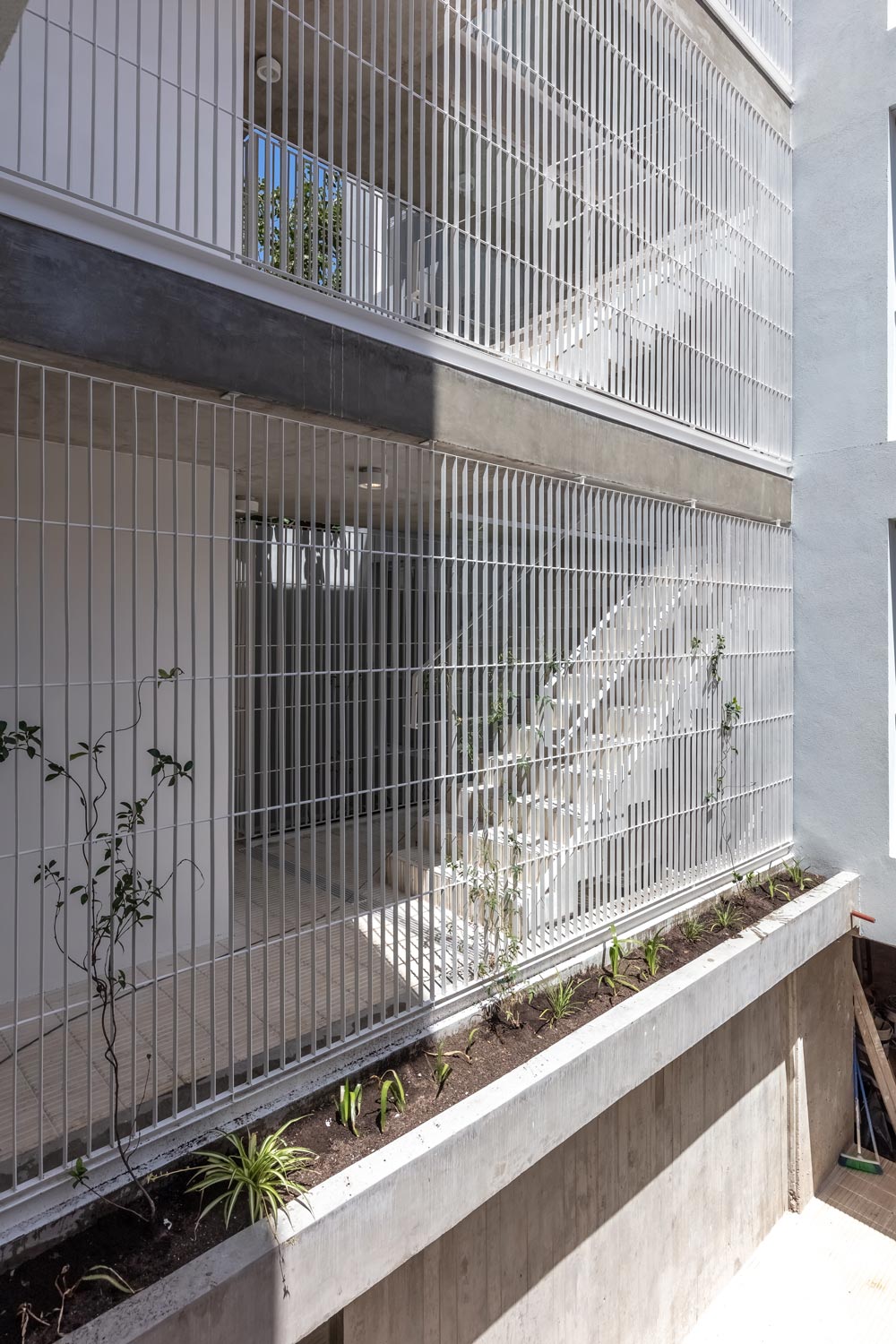 The façade towards the front is proposed as a filter with the same materiality, allowing the expansion of the units to be run, and assume multiple uses, adding a gradient to the exterior / interior relationship. The units are organized in relation to their use on the ground floor, arranging the living unit of 3 rooms towards the front of the land with a cross ventilation and the multipurpose units towards the quiet part of the building. The latter has the possibility of becoming both professional studios and divisible living units with 2 rooms. The duplex unit on the upper level also has a degree of indeterminacy and completeness that allows assuming the programmatic variability of the person who inhabits it. This unit is projected as an individual dwelling in height. All the front units have their own expansions and grills towards the interior patios, which respond to the expectations of the users.