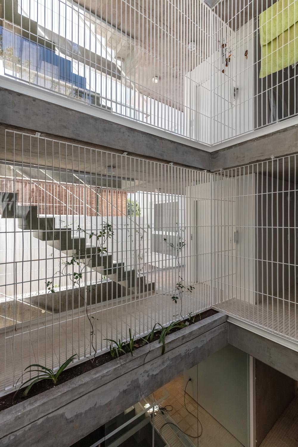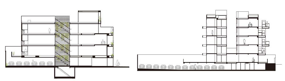 The built mass is interrupted, giving rise to the circulatory system as an articulator of intermediate spaces, in search of situations and encounters challenging new spatial possibilities. This articulating space is filtered by a metallic skin that allows the growth of vegetation on both sides.