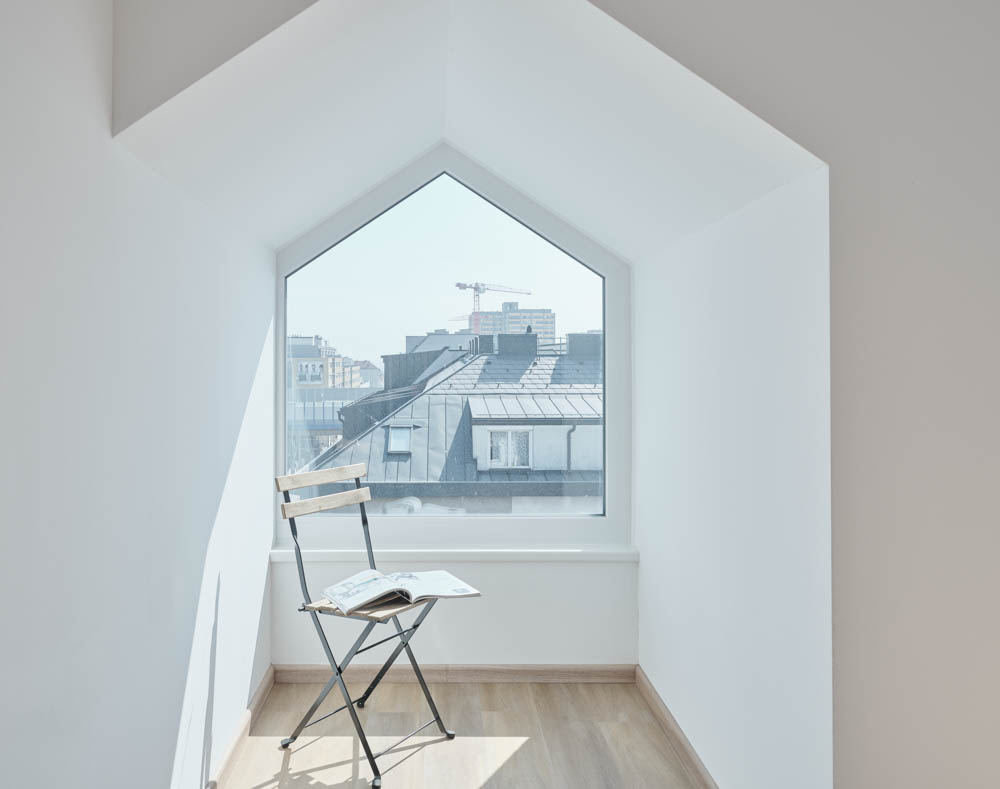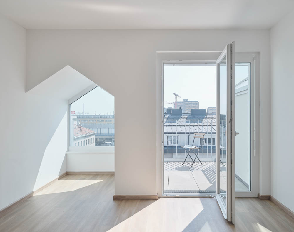 Fifty business apartments and six offices were constructed in a new building on an empty lot in Vienna. The first phase focused on supporting work for the necessary rededication. In further phases optimal light conditions were achieved by orienting all of the apartments facing South-East. Noise pollution was reduced by the same measure, since the orientation towards a more quiet side street acted as natural sound abatement.