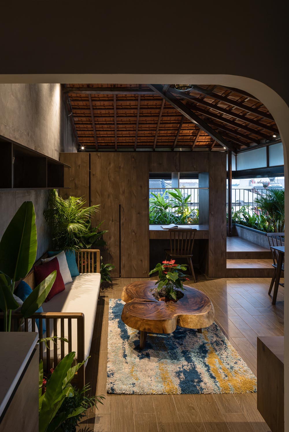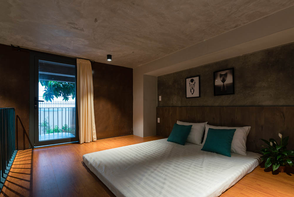 Two fronts are the advantage of the apartment, so the rooms open to the balcony with 2 fronts. If the lower floors show a youthful dynamism, the 2 garret apartments tend to be rustic and minimalistic. The garret has a traditional tiled roof showing off the structure for the truss, opening to the view of hanging gardens running along the house, bringing the sense of space of a mini penthouse. Standing on 2 garret rooms, you can see the mountain view of Vung Tau city. The apartment is completed by wooden furniture, bringing a warm feeling. The painted wall is gray, the base of the facade is accentuated with the steel plate material and is painted in rust to create a strong. These tones contribute to the highlight of the colorful bungalow moving above.
