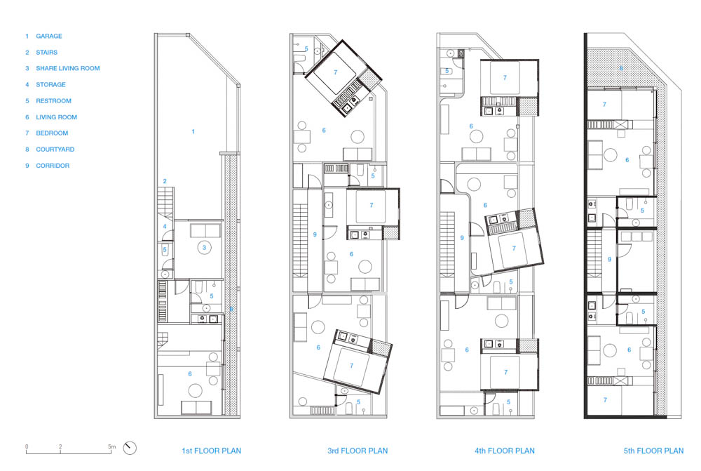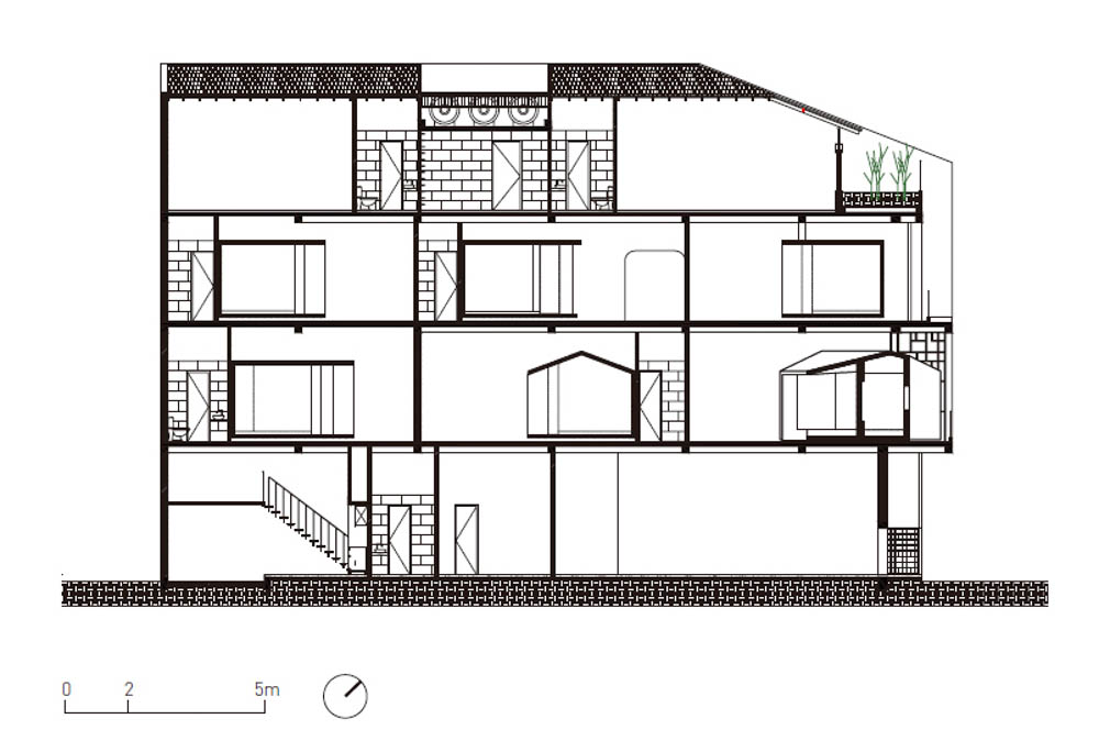 다이 안 공동주택은 기존 2층 규모의 누마루가 있는 건물이 임대아파트로 변환된 프로젝트다. 임대아파트는 경제성을 위하여 공간을 낭비하지 않고 사용해야 했다. 게다가, 쉬운 시공과 녹지공간 창출이라는 문제도 고려해야 했다. 때문에 내부 공간을 변화시키기 위해 경량 구조를 사용했다. 기존 출입구와 계단의 용도를 재분배하고 경량화한 구조는 재료와 건설 노동의 측면에서 비용을 감축하는 데 도움을 주었다. 주요 재료들은 재건축 시 유연성과 용이성을 부여해 주는 철재 프레임, 시멘트 보드, 철재 벽, 유리였다. 알록달록한 방갈로들은 집의 오래된 콘크리트 기둥들과 구조들을 가리면서 강렬한 움직임을 창조하기 위해 서로 다른 방향으로 회전한다. 2층 및 3층은 6개의 실들이 있으며, 각각 1개의 방갈로 블록을 갖고 있다.