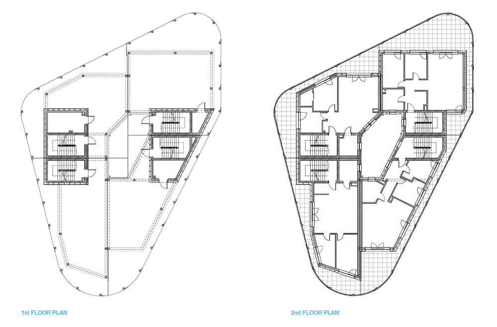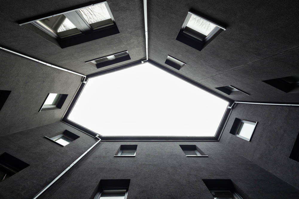 건축물의 부피감을 정사각형으로 표현하는 이 방법은 파사드를 다채롭게 만들고, 수직으로 분할되기도 한다. 네 가족을 위한 하나의 평면이 두 개 더해져, 이 공동주택은 총 8세대가 입주 가능하다. 건축물의 1층은 대부분 모든 거주자들의 공용 공간 역할을 해주는 빈 공간이 있다. 각 세대들은 그 외부 경계에 따라 다양한 폭을 가진 테라스 및 부가적으로 입구 영역에서 아파트와 화장실까지 빛을 비춰주는 중앙 아트리움이 이 거주지의 접근성을 높인다.