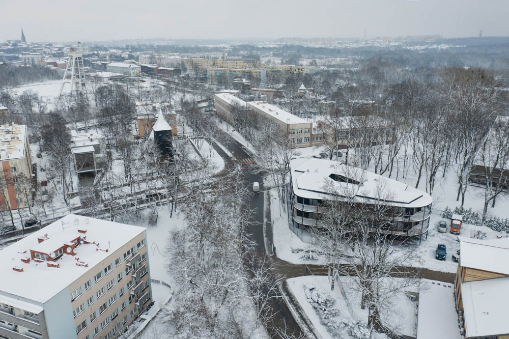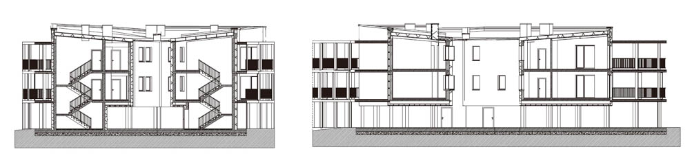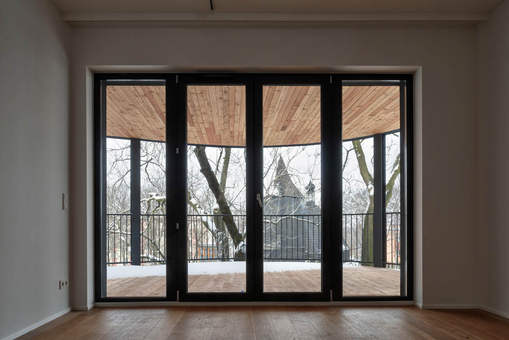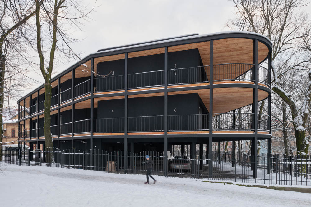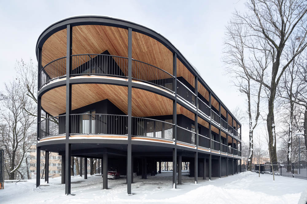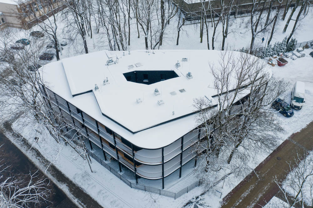 Despite the fact that it looks like one coherent apartment building, it was designed as a complex of four single-family, two-apartment group buildings. The building has been divided into four independently functioning parts, in which there are a total of eight apartments and the ground floor of the building is mostly empty space serving as a common part of all residents and the zone of entrances to the buildings with technical rooms. Each of the apartments has access to a terrace of various widths along its outer perimeter, and to a patio, which additionally illuminates the entrance areas to the apartments and the bathroom.