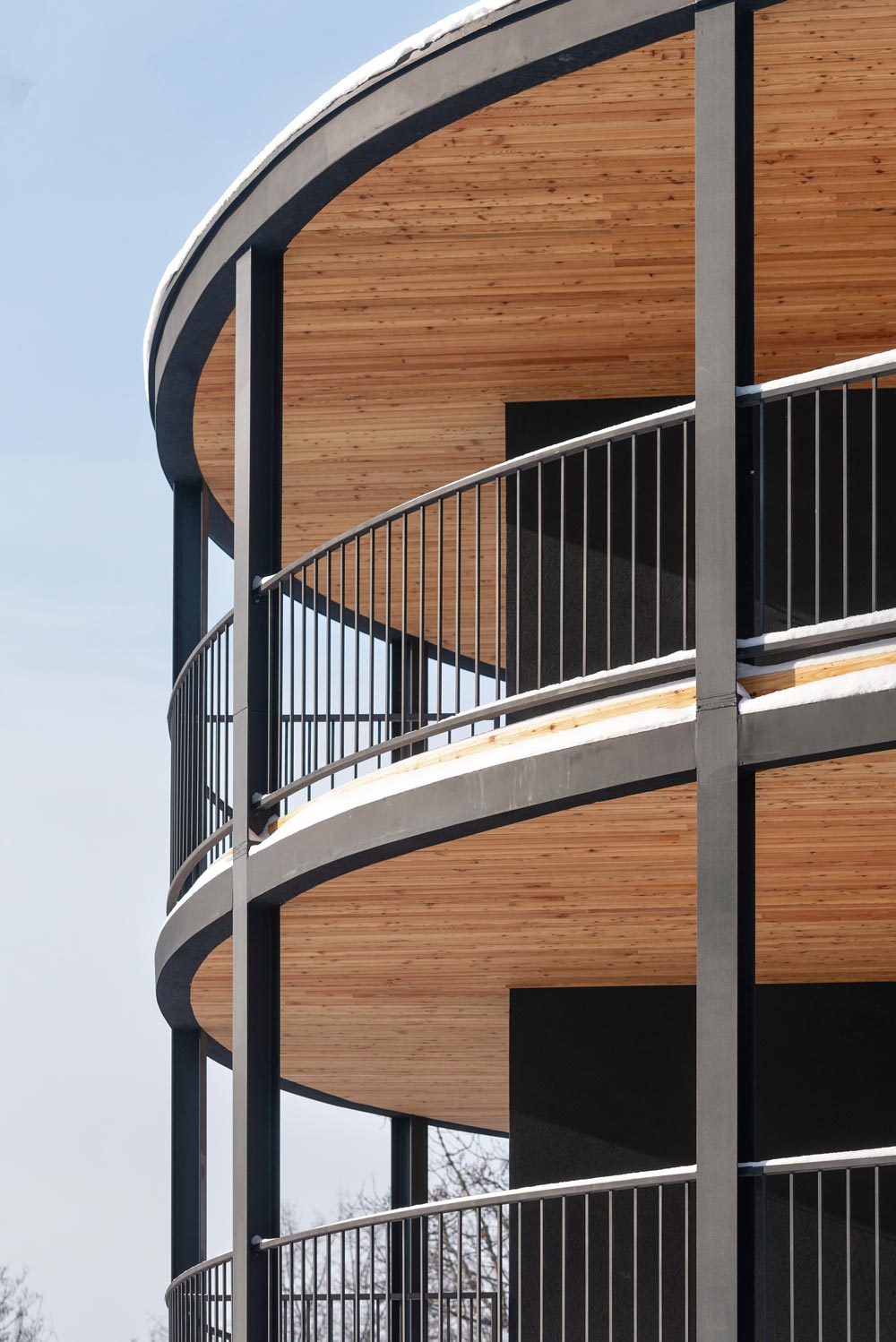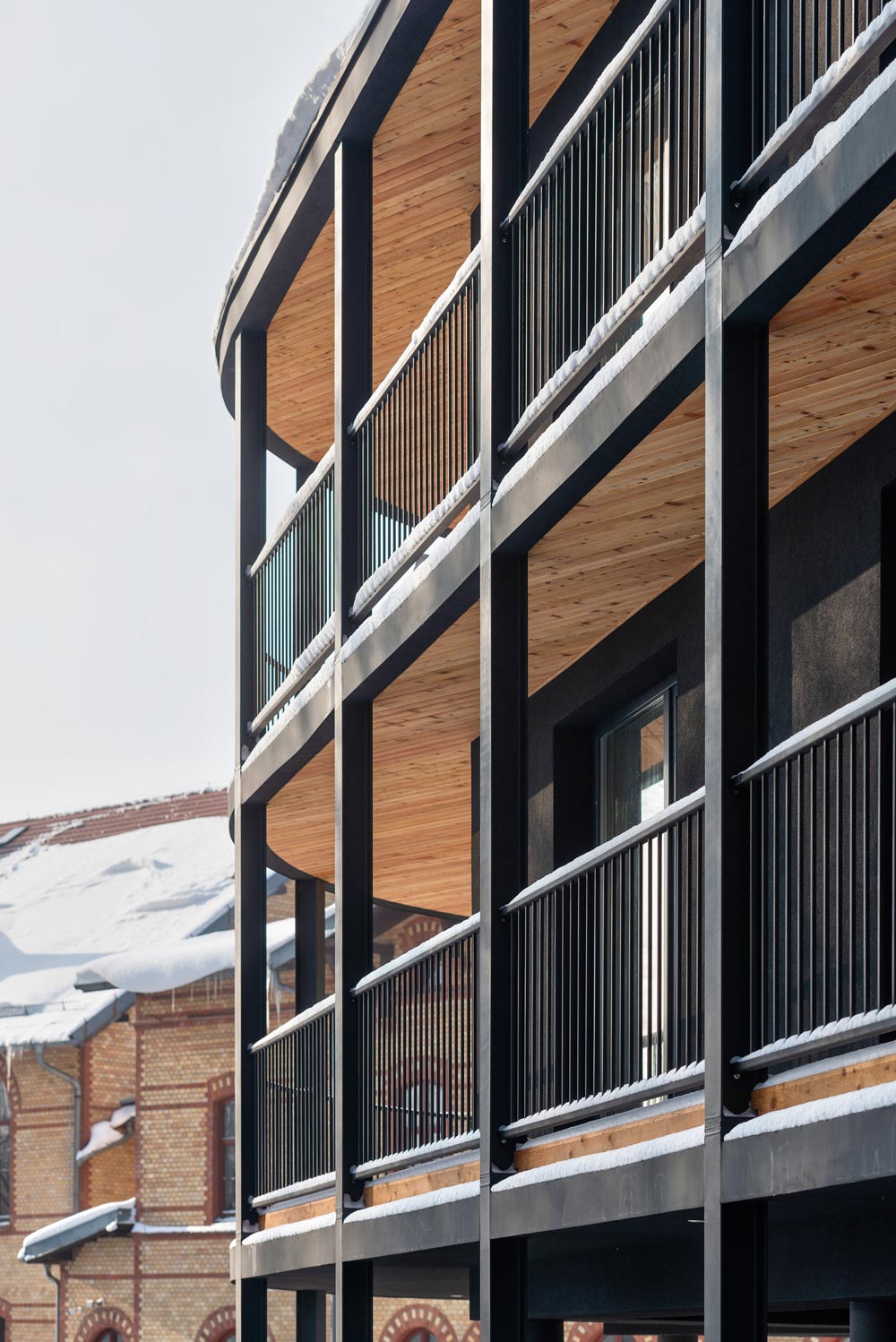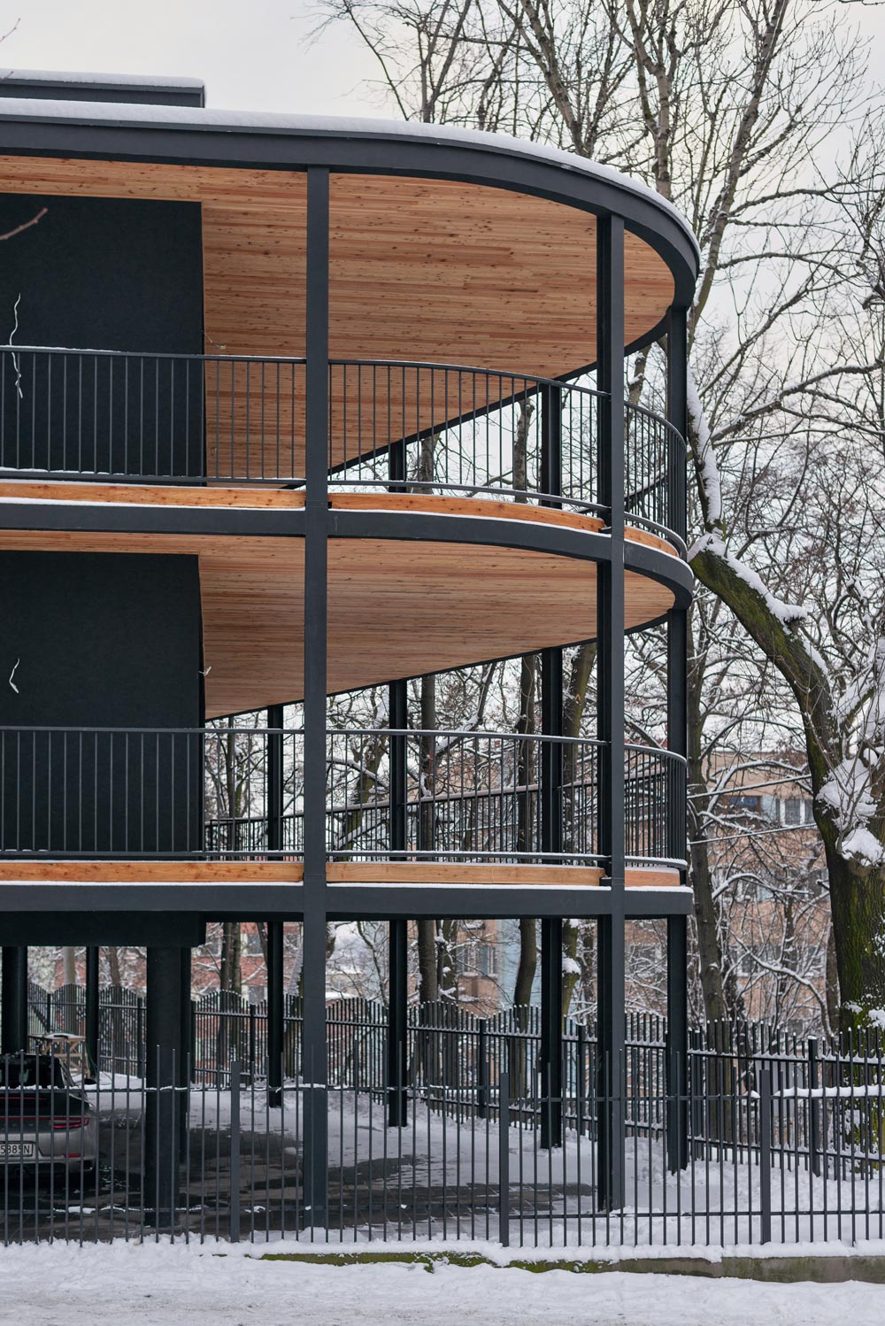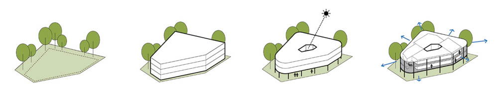 The unique context of the place and the potential negative consequence of implementing a new tissue in this area meant that the decision to shape a new building was not easy and had to refer directly to these guidelines. The idea of the building resulted from the irregular polygonal shape of the area intended for development. Creating the form step by step, first of all: the solid was formed in accordance with the function of the apartments, optimizing their function into the shape of an irregular polygon. Then, a perimeter line was marked along the plot boundaries and the block of flats was surrounded with balconies to obtain a panoramic opening to the surroundings. In the next step, to open the view to the surroundings, the block was dressed in wooden viewing terraces with various surfaces around it, an internal break in the form was introduced by implementing a patio to illuminate the internal parts of the apartments (bathrooms and entrance areas to the apartments) and the floor of the residential part was raised by one level, leaving undeveloped ground floor as a space for social interactions of residents and additional external functions. In the last step, the rhythm of the elevation was shaped. Vertical divisions of the façade were introduced, creating expressive regular squares arranging the freely formed volume of the building.