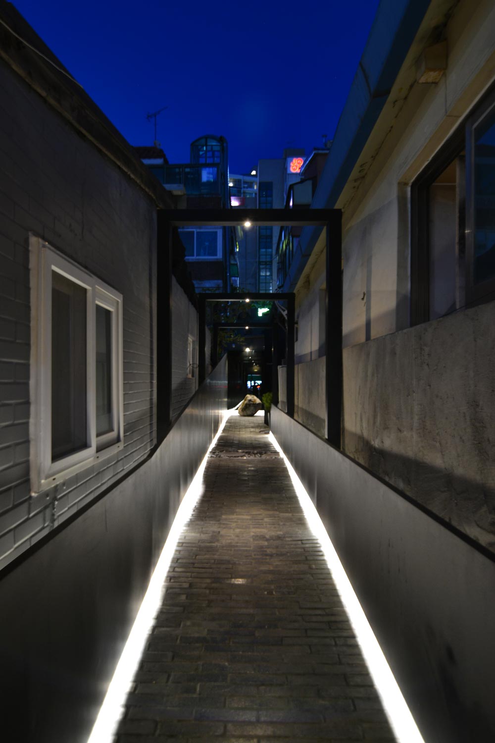 익숙한 풍경의 대로변에 존재감을 드러내는 입구 너머로 비밀의 정원과도 같은 통로가 자연스럽게 공간으로 인도한다. 통로 끝에 묵직하게 놓여있는 바위는 OOMPH의 상징적인 오브제 역할과 동시에 공간의 진입을 알려주며 호기심을 불러일으킨다. 리모델링 전 건물은 1950년대에 지어졌으며 사방으로 건물들이 둘러싸고 있어서 자연스럽게 은닉할 수 있는 조건으로 은밀한 분위기를 간직한 사이트였다. 클라이언트는 이곳에 비밀공간과도 같은 아지트를 모티브로 와인바를 설계하고자 하였고, 우리는 이를 토대로 ‘비가 내리는 밤’이라는 컨셉으로 협소한 부지위에 상징성을 드러내며 운치를 품은 와인바 OOMPH를 만들게 되었다.