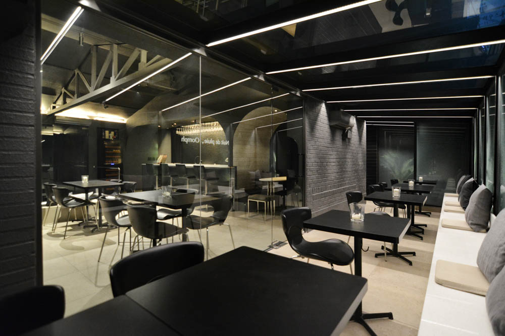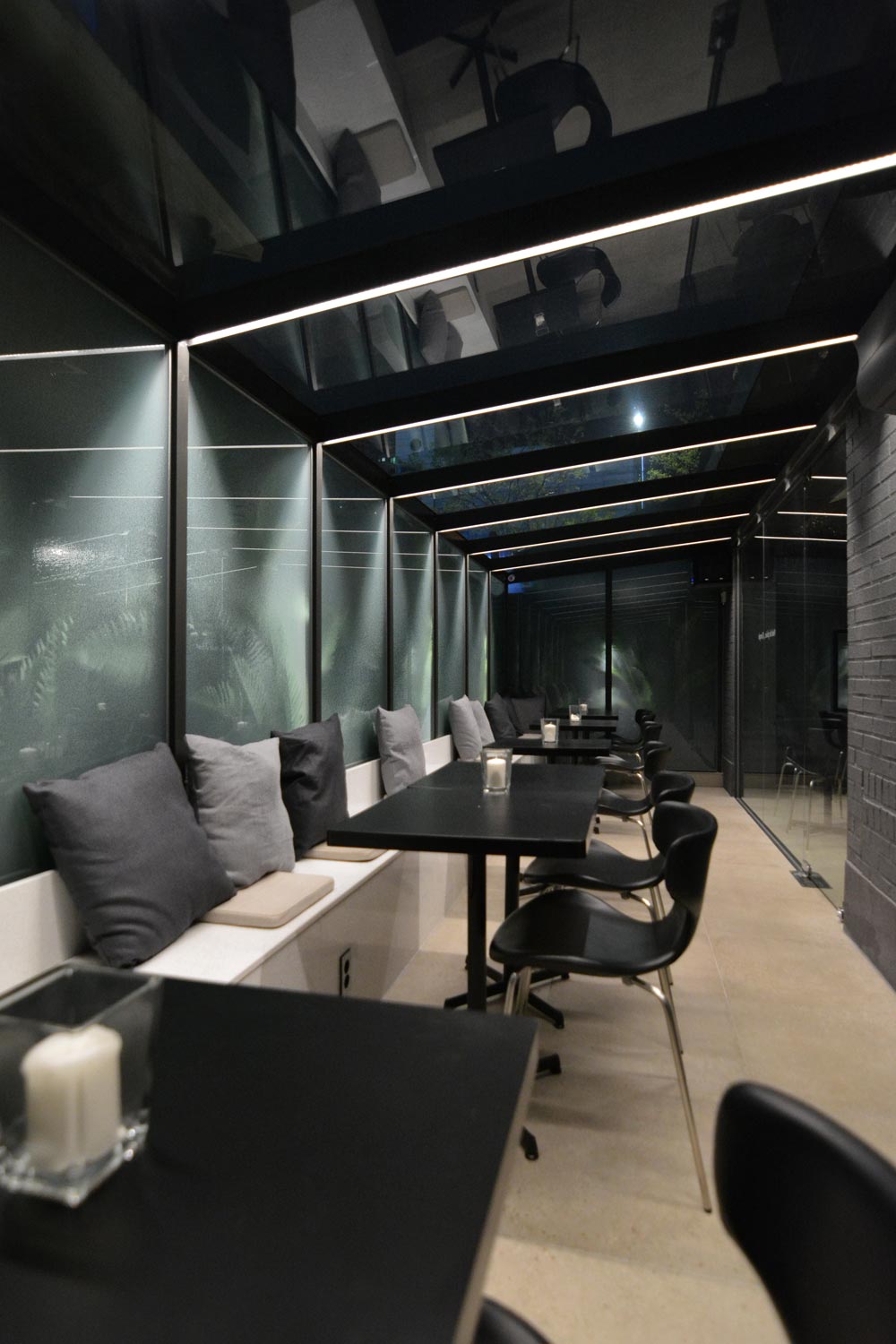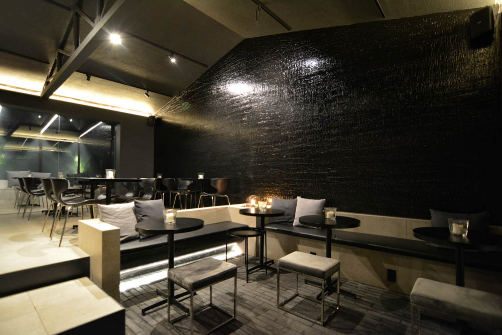 The lounge, which naturally continues from the access road, uses the same brick as the floor finish to draw the exterior into the interior and guide the circulation, and the level of the sofa tables were lowered to create a comfortable atmosphere. A bar table and normal tables were placed in the hall area by smoothly segregating the boundary of the space using the step difference. In order to capture the concept of a ‘rainy night’, a wall with a dreamy and mysterious ambiance was created by reinterpreting the moment when rain flows on one wall that embraces the space. A service bar and kitchen are formed beyond the bar table, and a more independent booth space was created on the right side. The elevation of the bar table and booth space was made in the form of a round arch, creating a cozy feeling of having n umbrella up on a rainy night. The inner hall of OOMPH is located in the terrace space. The design of the wall that resembles a fogged-up glass window on a rainy day continues in the same context as the concept of the space, and is also a structure that conceals the outer wall of the adjacent building.