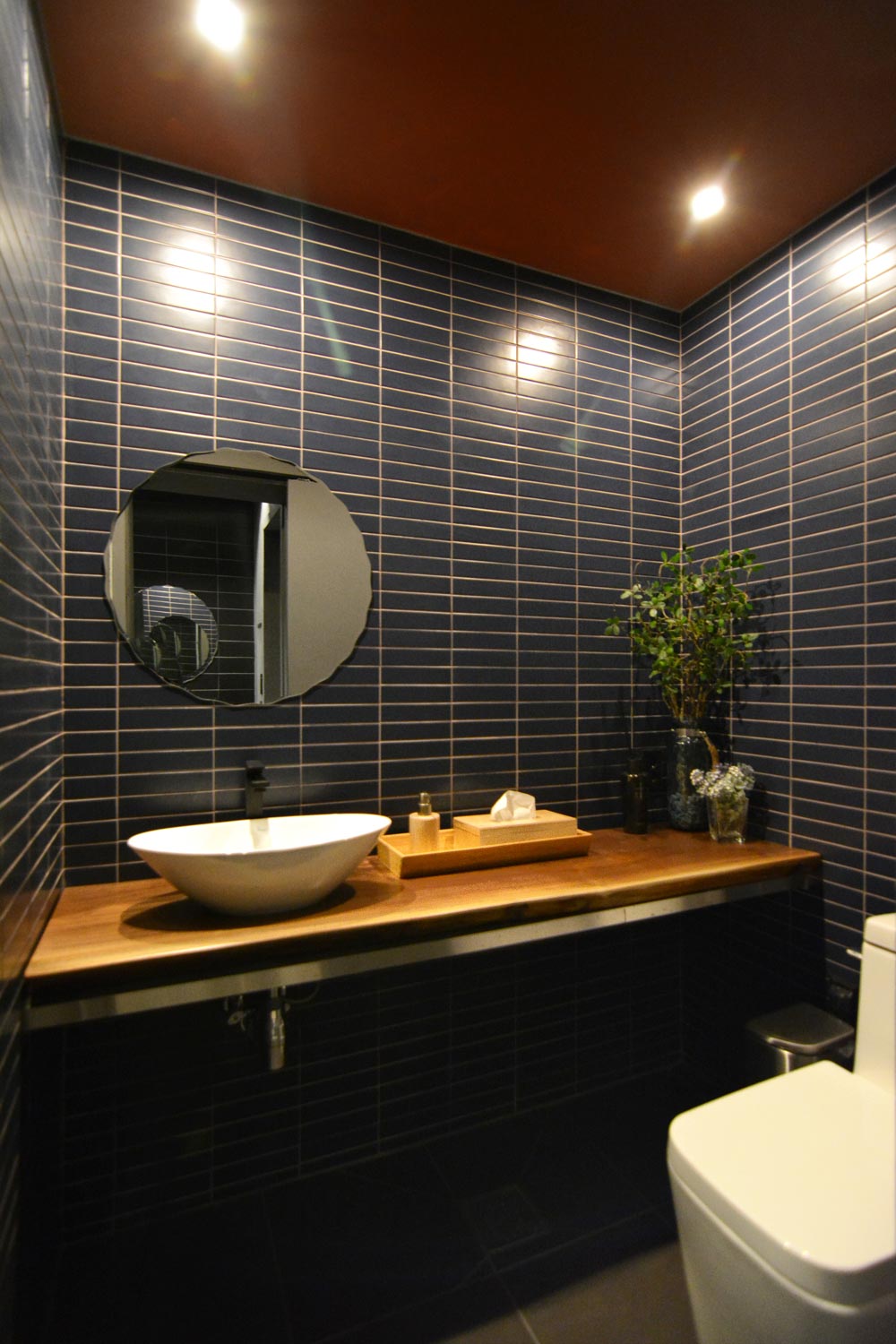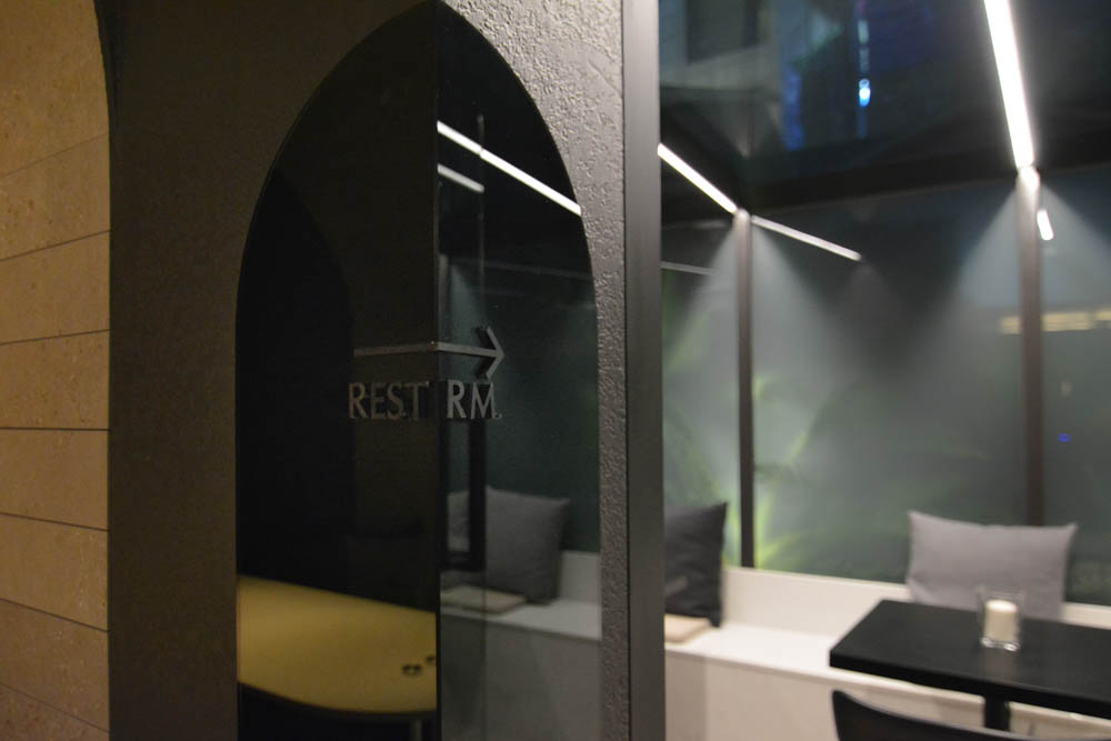 Beyond the entrance, which reveals its presence on the familiar roadside, a passage that resembles a secret garden naturally leads to the space. The heavy rock at the end of the passage serves as a symbolic objet of OOMPH and at the same time informs the entrance to the space, and provokes curiosity. The building before the remodeling was built in the 1950s, and it was a site with a secretive ambiance as being surrounded by buildings all around allowed it to naturally hide. The client wanted to design a wine bar with the motif of a secret hideout here. Based on this, we created OOMPH, a wine bar that depicts symbolism on a small site, with the concept of ‘rainy night’.