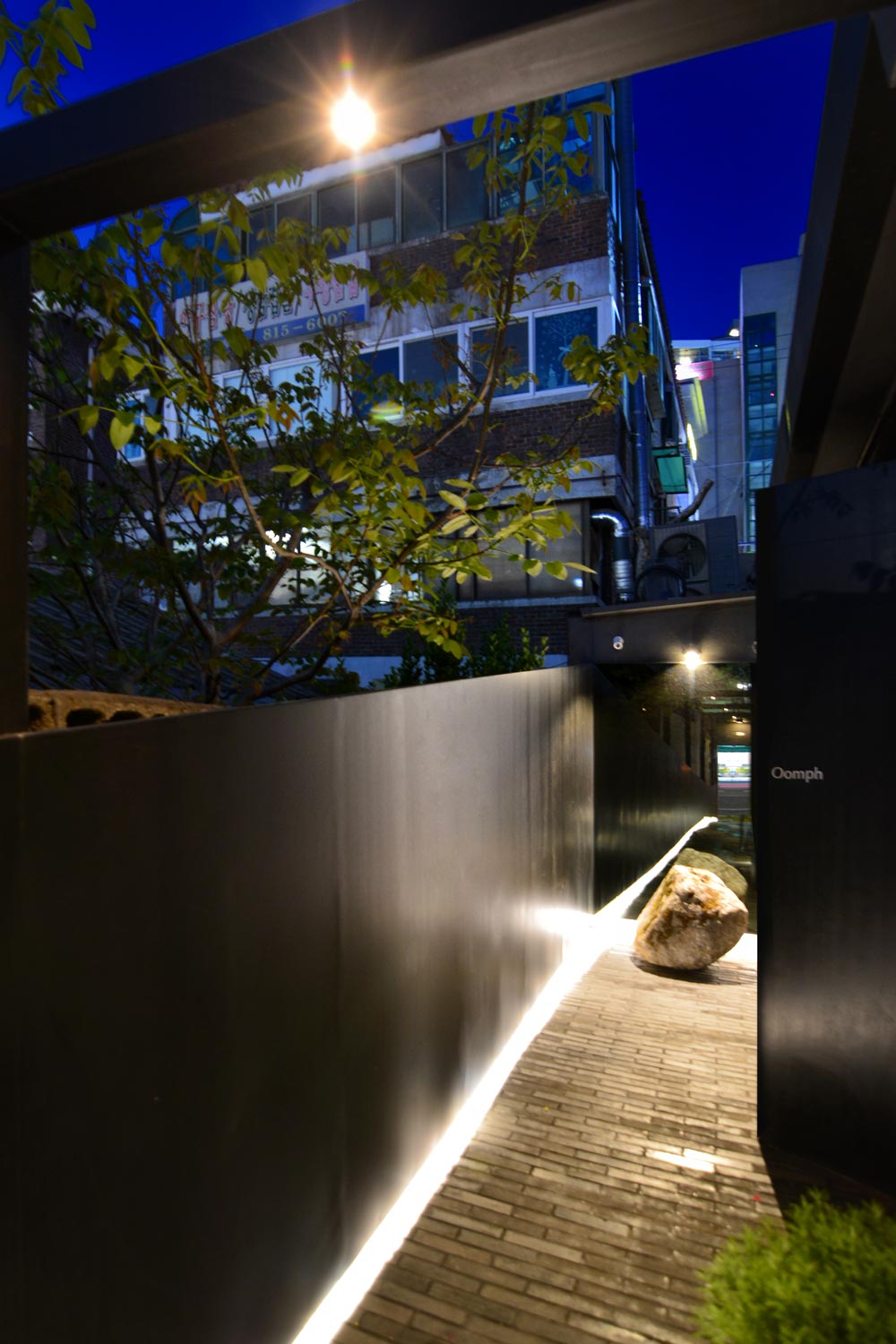 익숙한 풍경의 대로변에 존재감을 드러내는 입구 너머로 비밀의 정원과도 같은 통로가 자연스럽게 공간으로 인도한다. 통로 끝에 묵직하게 놓여있는 바위는 OOMPH의 상징적인 오브제 역할과 동시에 공간의 진입을 알려주며 호기심을 불러일으킨다. 리모델링 전 건물은 1950년대에 지어졌으며 사방으로 건물들이 둘러싸고 있어서 자연스럽게 은닉할 수 있는 조건으로 은밀한 분위기를 간직한 사이트였다. 클라이언트는 이곳에 비밀공간과도 같은 아지트를 모티브로 와인바를 설계하고자 하였고, 우리는 이를 토대로 ‘비가 내리는 밤’이라는 컨셉으로 협소한 부지위에 상징성을 드러내며 운치를 품은 와인바 OOMPH를 만들게 되었다.