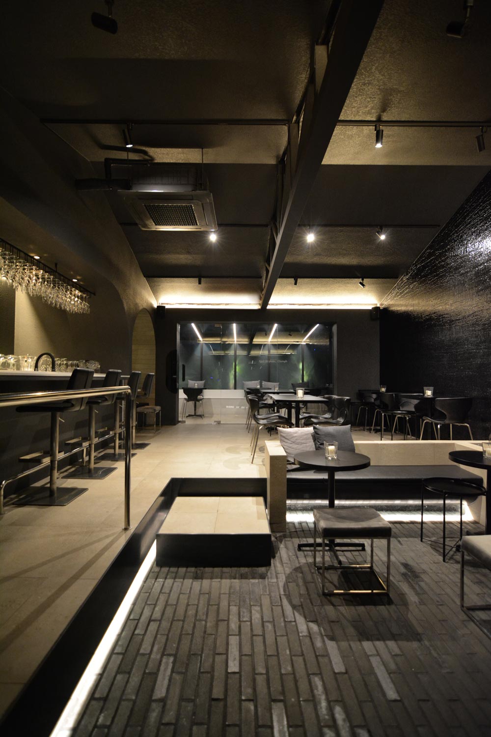 Rather than exposing the space on the roadside to attract many customers, OOMPH was designed to exist as a wine bar, as a space that only people who know about it can come to by creating a hideout where one can get lost in thought in the calm ambiance on a rainy night, and as a space with a special and secret charm, as is the meaning of the word OOMPH.