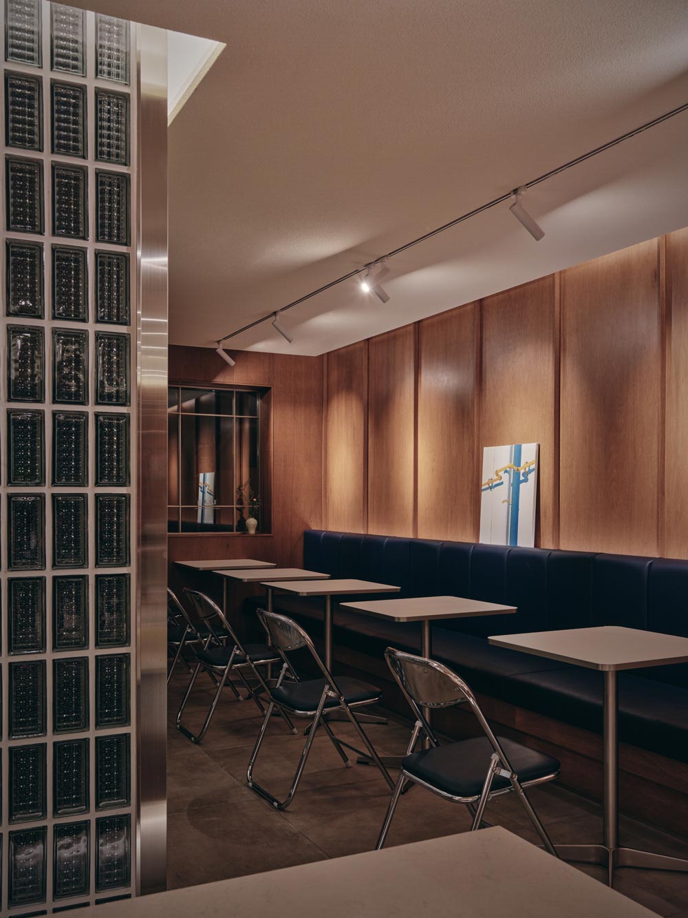 MAAT, by maximizing the merit of being located in the corner of the alley, secured abundant light through the open terrace at the corner. Furthermore, a coffee culture space, where one can comfortably rest and go, was aimed to be created by forming frameless folding doors and seats using old materials. This space is an open space that communicates with local residents, and it is a lyrical space within the city that can only be felt in MAAT, where the local scenery, wind, air, and sunlight can be found, as it inherits the rests, conversations and relaxed feelings that existed on the flat wooden bench in front of the existing Hanyang Supermarket. In addition, red bricks that are commonly found in old factory buildings in Seongsu were replaced with glass blocks as a modern reinterpretation of the material, and the wood and mustard color, which in contrast have warm properties, harmonize with each other in the space. The three materials permeate the past and present, and express the story containing the coexistence of the future. Although it is small, space was also allocated to the men’s and women’s restrooms for customer convenience. Royal blue velvet curtains were used at the entrance to the restrooms and staff space to convey the impression of a secret space.