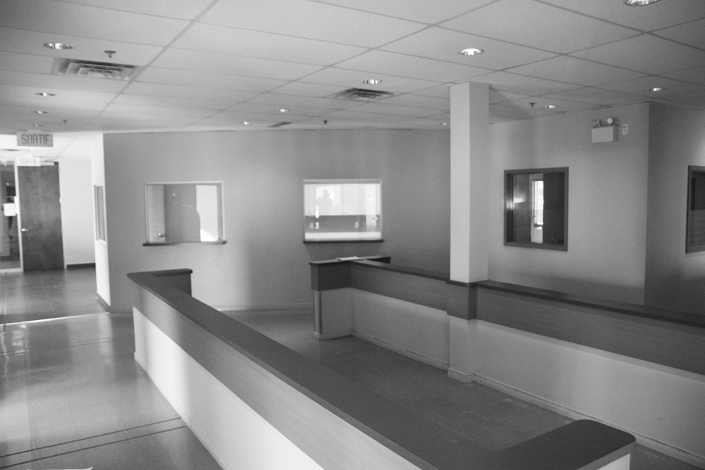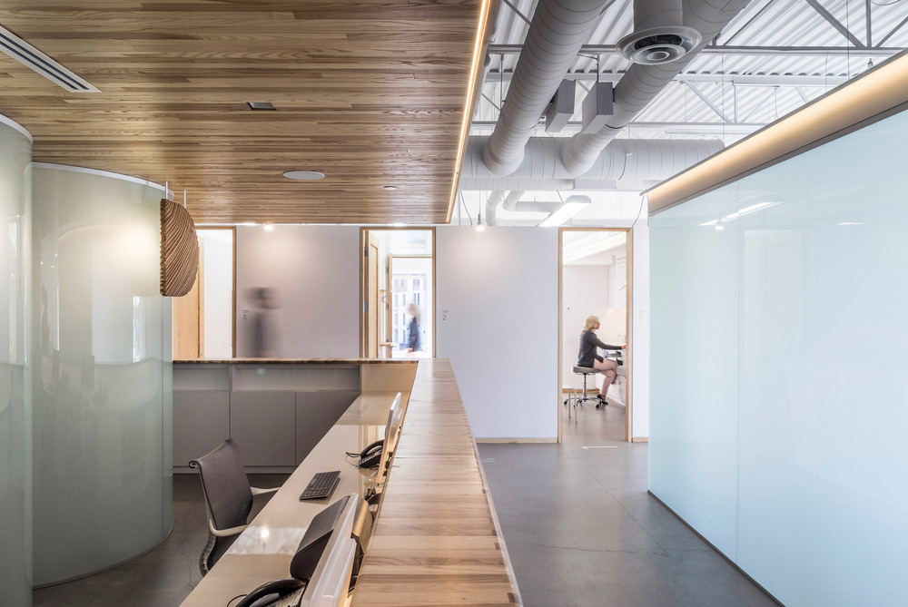 Light, a critical ingredient of many dermatological treatments, is the starting point from which the project evolves. Despite its large windows facing east onto Avenir Boulevard and south onto the Montmorency metro station parking lot, the former paediatric clinic that occupied this space was dark and uninspiring. The position of the waiting room in the centre, with windowless examination rooms surrounding it, shut clients off from the outside world and its views and natural light. To make the most of the large openings, the entire office was transformed into an open-plan space with translucent elements serving different functions within the clinic, letting the abundant natural light filter in all around. The ceiling, covered wall to wall in acoustic tiles, was exposed to make the area feel more spacious.