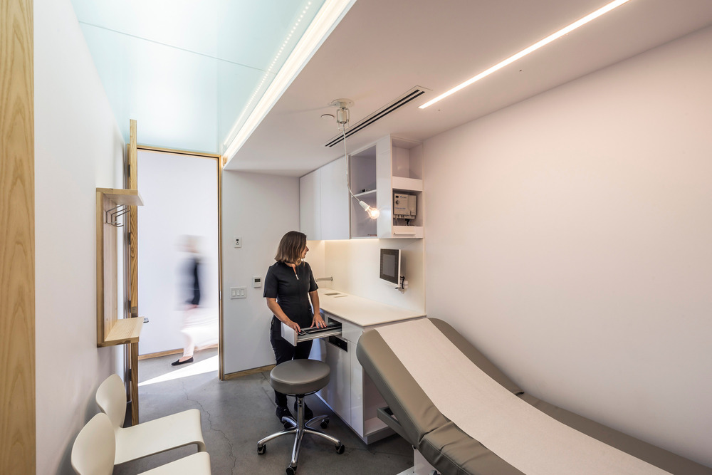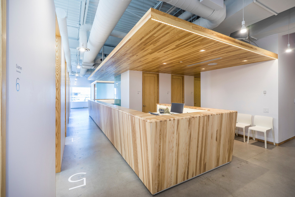 자연광을 보완하기 위해 매달린 Wi-Fi LED 전구를 각 구역별로 원하는 강도와 색상으로 프로그래밍할 수 있다. 8'-0" 높이로 설치되며, 사용자에게 너무 눈부시지 않고 최대에너지 효율적인 밝기를 제공한다. 오목한 LED 조명 스트립은 책상 위와 대기실 전체에 걸쳐 있는 커다란 나무 돌출부를 강조한다. 동일한 유형의 매입형 조명은 리셉션 데스크에 일렬로 배치되어 직원의 작업 공간을 밝힌다. 마지막으로, 각 검사실에는 다양한 LED 소스에서 쏟아지는 빛을 가지고 있어 매우 광범위하지만 매우 효율적인 스펙트럼이 생성된다. 유리 천장 뒤 패널, 같은 천장을 따라 삽입된 선형 스트립, 내장 조명 형태 검사 테이블 위의 고정 장치와 환자 옆의 조절 가능한 팔에 있는 방향성 Wi-Fi 전구. 유리 천장과 서비스 복도로 통하는 문은 자연 채광이 확산되는 배치를 완성한다. 공간의 강렬한 밝기는 환자의 육안 검사의 정확성을 높여준다.