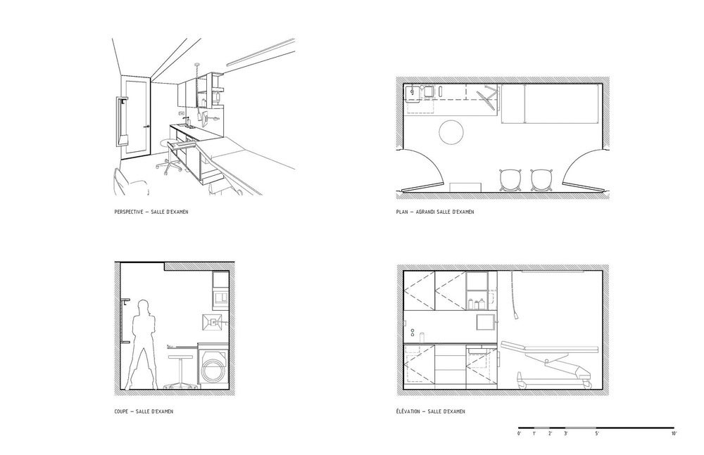 빛은 많은 피부과 치료의 중요한 성분으로, 이 프로젝트가 발전하는 출발점이다. Avenir Boulevard 동쪽을 향한 커다란 창문과 Montmorency 지하철역 주차장에도 불구하고, 이 공간을 위치하고 있던 이전의 소아과 클리닉은 어둡고 감흥이 없었다. 창문이 없는 검사실이 둘러쳐진 가운데 대기실의 위치는 외부와 고객을 차단하고 전망과 자연광을 차단한다. 대형 개구부를 최대한 활용하기 위해 진료실 내 다양한 기능을 제공하는 반투명한 요소를 갖춘 오픈 플랜 공간으로 탈바꿈해 풍부한 자연광이 사방을 여과할 수 있도록 했다. 방음 타일로 벽면을 덮은 천장은 더욱 넓은 느낌을 주기 위해 노출됐다.