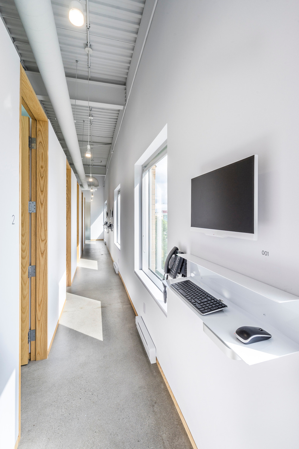 이 클리닉은 환자들의 환영과 위안을 주는 장소일 뿐만 아니라 오랜 시간을 일하는 직원들의 요구를 충족시켜야 한다. 그것은 조직적인 면에서 효율적이어야 하고 배치되는 방식에서도 쾌적해야한다. 이를 위해서는 클리닉의 전문가들은 환자들의 시야에서 벗어나 공용 구역, 사무실 및 검사실 사이를 이동할 수 있어야 한다. 상담실을 외벽에서 멀리 이동함으로써 직원들이 이동할 수 있는 긴 서비스 복도가 확보됐다. 이 공간의 진정한 중추인 공간 배치는 간호사, 기술자, 의사들이 자유롭게 이 방에서 저 방으로 이동하면서 환자의 컴퓨터 기록을 참조하고 의견과 정보를 교환하거나 사무실과 휴게실까지 갈 수 있는 밝고 활기찬 복도를 만들었다. 의료진이 환자를 보기 전이나 후에 기록을 조회할 수 있도록 컴퓨터 워크스테이션이 벽에 장착되어 있어 이 전략적 통로를 막지 않는다. 직원들은 환자들의 호기심 어린 시선으로부터 보호되는 밀폐된 투명한 블록에서 휴식을 취할 수도 있다.