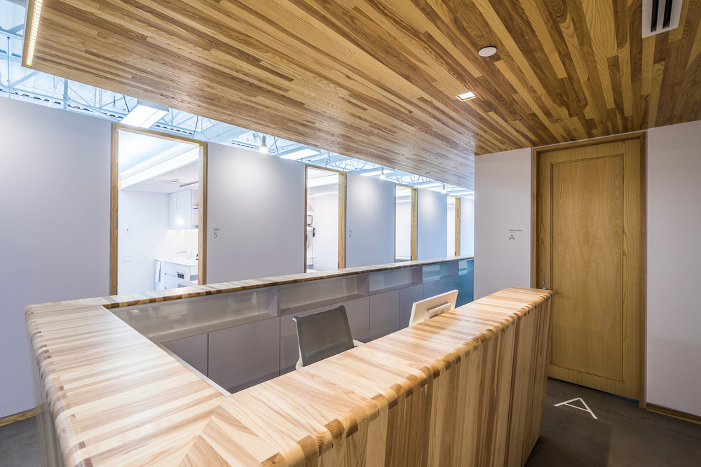 To supplement the natural light, hanging Wi-Fi LED bulbs can be programmed to the desired intensity and colour for each zone. Installed 8’-0” high, they offer users maximum energy-efficient brightness, without being too blinding. Strips of recessed LED lights highlight the large wood overhang above the desk and the whole of the waiting room. The same type of recessed lighting lines the reception desk to light up the work surfaces for staff. Lastly, each examination room has light flooding from a variety of LED sources, producing a very expansive but highly efficient spectrum: in panels behind the glass ceiling, in inset linear strips along the same ceiling, and in the form of a built-in light fixture above the exam table and a directional Wi-Fi bulb on an adjustable arm beside the patient. The glass ceiling and doors to the service corridor complete the layout with diffused natural light. The intense brightness of the space lends itself well to greater precision in the visual examination of patients.
