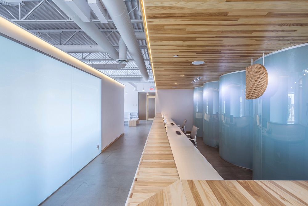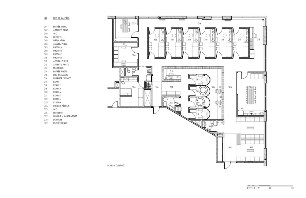 빛은 많은 피부과 치료의 중요한 성분으로, 이 프로젝트가 발전하는 출발점이다. Avenir Boulevard 동쪽을 향한 커다란 창문과 Montmorency 지하철역 주차장에도 불구하고, 이 공간을 위치하고 있던 이전의 소아과 클리닉은 어둡고 감흥이 없었다. 창문이 없는 검사실이 둘러쳐진 가운데 대기실의 위치는 외부와 고객을 차단하고 전망과 자연광을 차단한다. 대형 개구부를 최대한 활용하기 위해 진료실 내 다양한 기능을 제공하는 반투명한 요소를 갖춘 오픈 플랜 공간으로 탈바꿈해 풍부한 자연광이 사방을 여과할 수 있도록 했다. 방음 타일로 벽면을 덮은 천장은 더욱 넓은 느낌을 주기 위해 노출됐다.