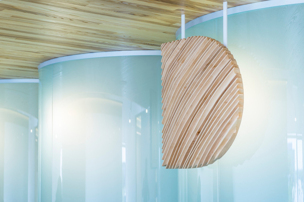 The six examination rooms, featuring frosted glass ceilings, form a long white wall punctuated by six high wooden doors. With its imposing opalescent glass wall and lowered ceiling, the relaxation room for the clinic’s professionals looks like a glowing cube. Light therapy machines sit imposingly in the centre, behind reception. The curved translucent glass walls that encapsulate them give away their function, as they emit an entrancing purple light when in operation. A long, solid ash reception desk wraps around this central core, with an entrance on either end: dermatology (main entrance) and light therapy (secondary entrance).