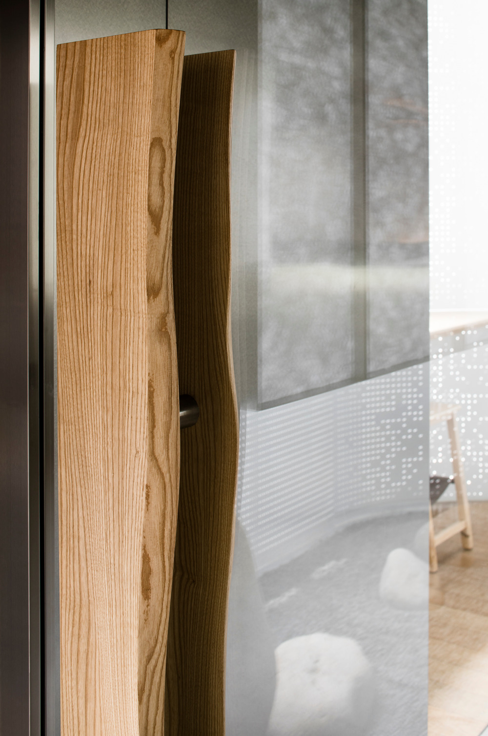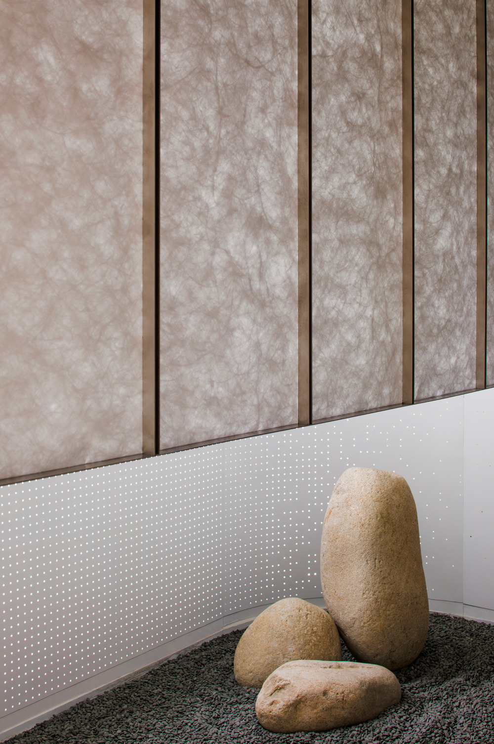 The foyer design is a nod to the tradition of Japanese hospitality. A small zen garden, a light-softening shoji screen, and a stone path of different textures welcome guests into a curated version of nature. Instead of the common use of a wooden frame, the screen is a continuation of the stainless steel ceiling grille, a feature throughout the site signifying the industrial purpose of the place and giving a sense of order.