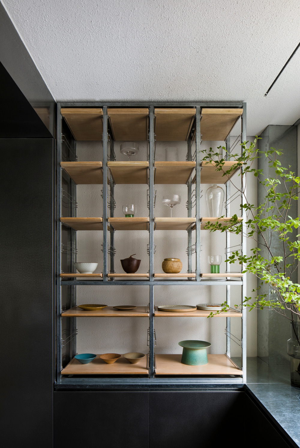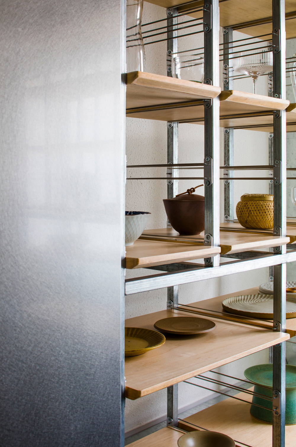 A reflective panel centered above the main dining table mirrors subtle hues of the outside green or the colourful food below, adding an ephemeral spectacle. In the display corner, selected accessories are backlit by soft daylight through translucent glass backing. The shelving in front of the window can slide on a track and hide the existing window from view. Each unit is a galvanized steel frame where wooden boards are held by rack support, fitting in like kitchen equipment.