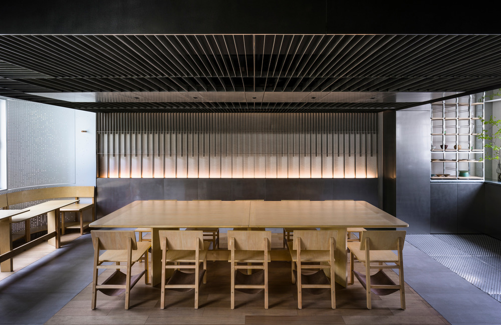 The first location of Shikaku is a central kitchen equipped with about 20 seats, allowing dine-in and events. The given site is on the 3rd floor of a mid-rise building along the tree-lined Huashan Road. A series of bay windows comprise the west facade with brise-soleil in front. The view of lush tree canopies, together with dramatic daylight gives the existing site its unique calming atmosphere. In response to the site characteristics and the brand’s operational rigor in practicing a green dining model, Lukstudio explored how to express gentleness with precision in a compact space.