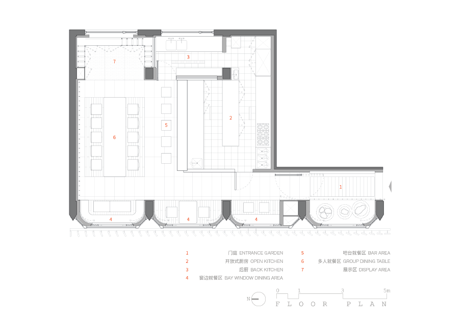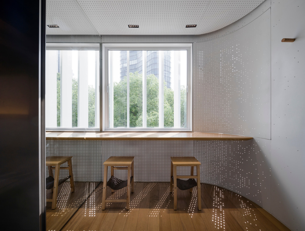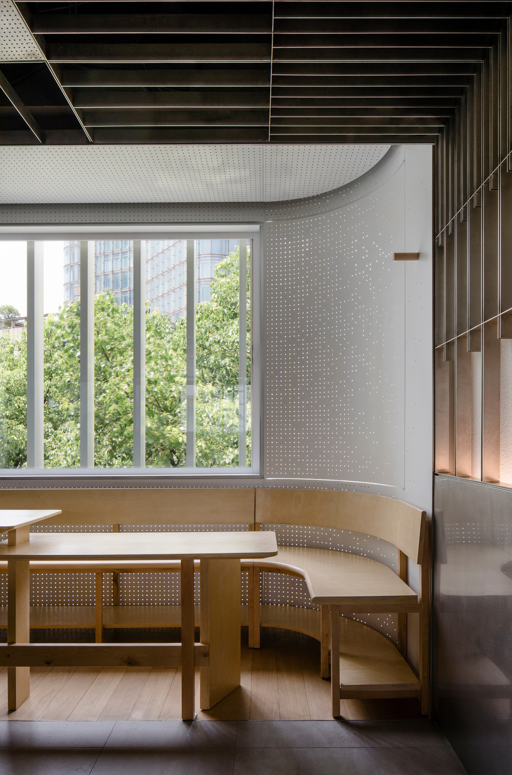 원래의 퇴창은 좌석 틈새로 변형된다. 도시락통이 다양한 칸막이로 나뉘어 있는 것에서 영감을 받은 각 흰색 틈새에는 개인, 한 쌍 또는 단체 식사를 수용할 수 있는 목재 가구 세트가 있다. 기존 창 앞에서 부분적으로 열리는 천공 패널의 곡면 벽은 프레임을 숨기고 하나의 단일 초점 뷰를 캡처합니다. 차양과 그라데이션 천공을 통해 자연광은 낮이 지남에 따라 다양한 형태로 반짝임을 연출한다.