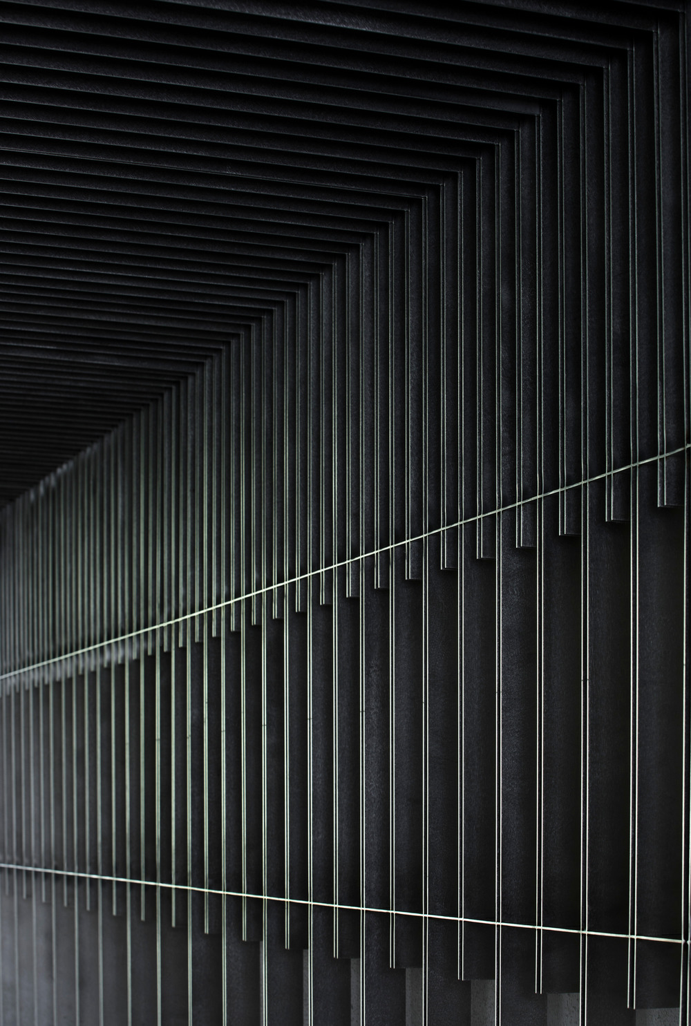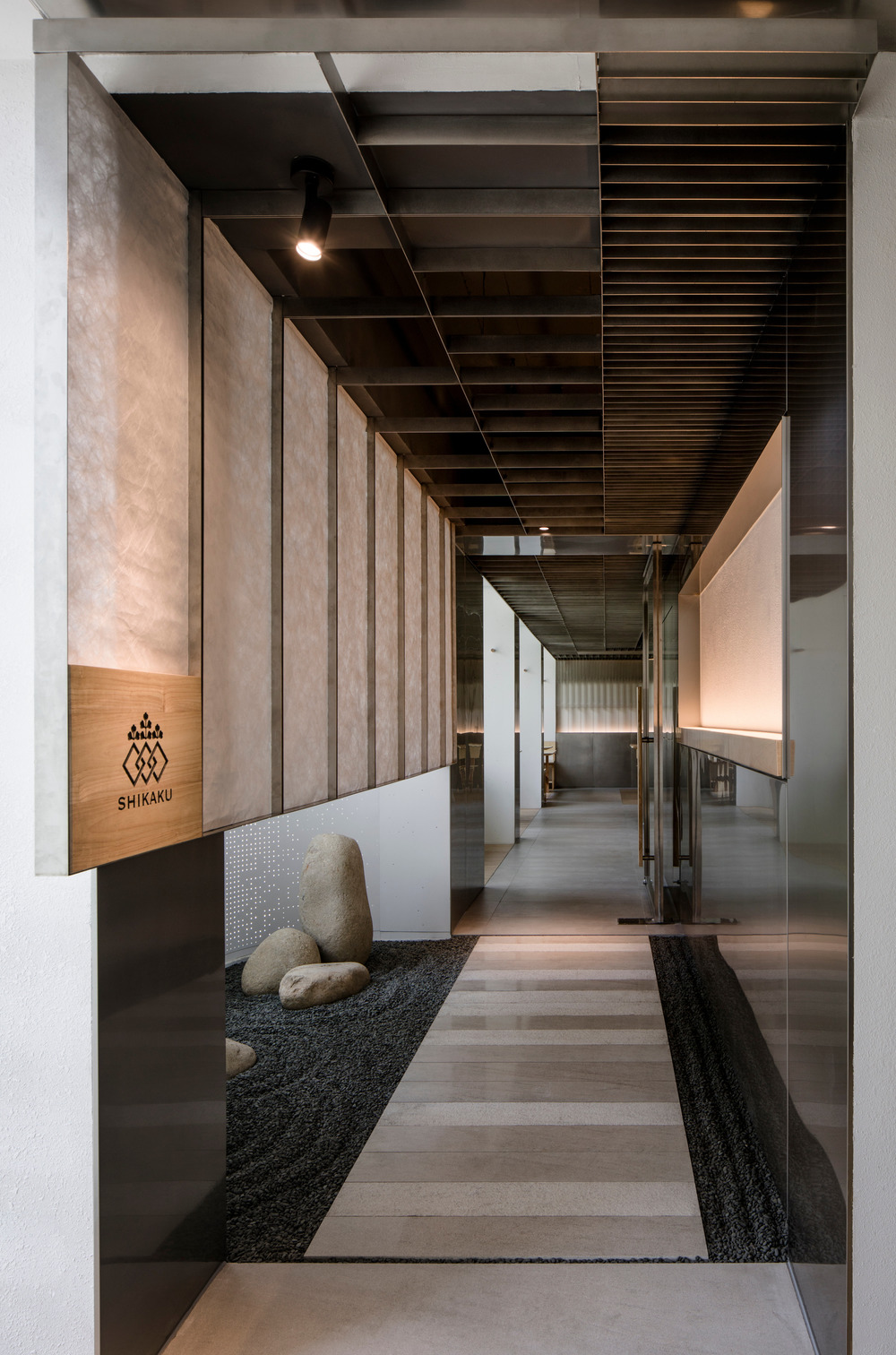The foyer design is a nod to the tradition of Japanese hospitality. A small zen garden, a light-softening shoji screen, and a stone path of different textures welcome guests into a curated version of nature. Instead of the common use of a wooden frame, the screen is a continuation of the stainless steel ceiling grille, a feature throughout the site signifying the industrial purpose of the place and giving a sense of order.