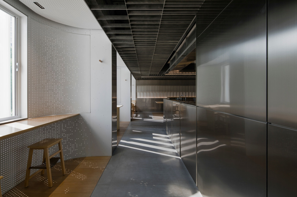 스테인리스 스틸의 차갑고 억제하는 성질을 보완하기 위해 다양한 광택으로 형태를 연결하여 섬세한 인상을 준다. 재활용 바닥재, 가구 및 문 손잡이와 같은 목재로 강조된 부분은 균형을 이루는 데 필수적이다. 조용한 분위기를 위해 천공 패널 뒤에 설치된 흡음재는 작업 중인 주방의 소음과 잔향을 줄여준다.