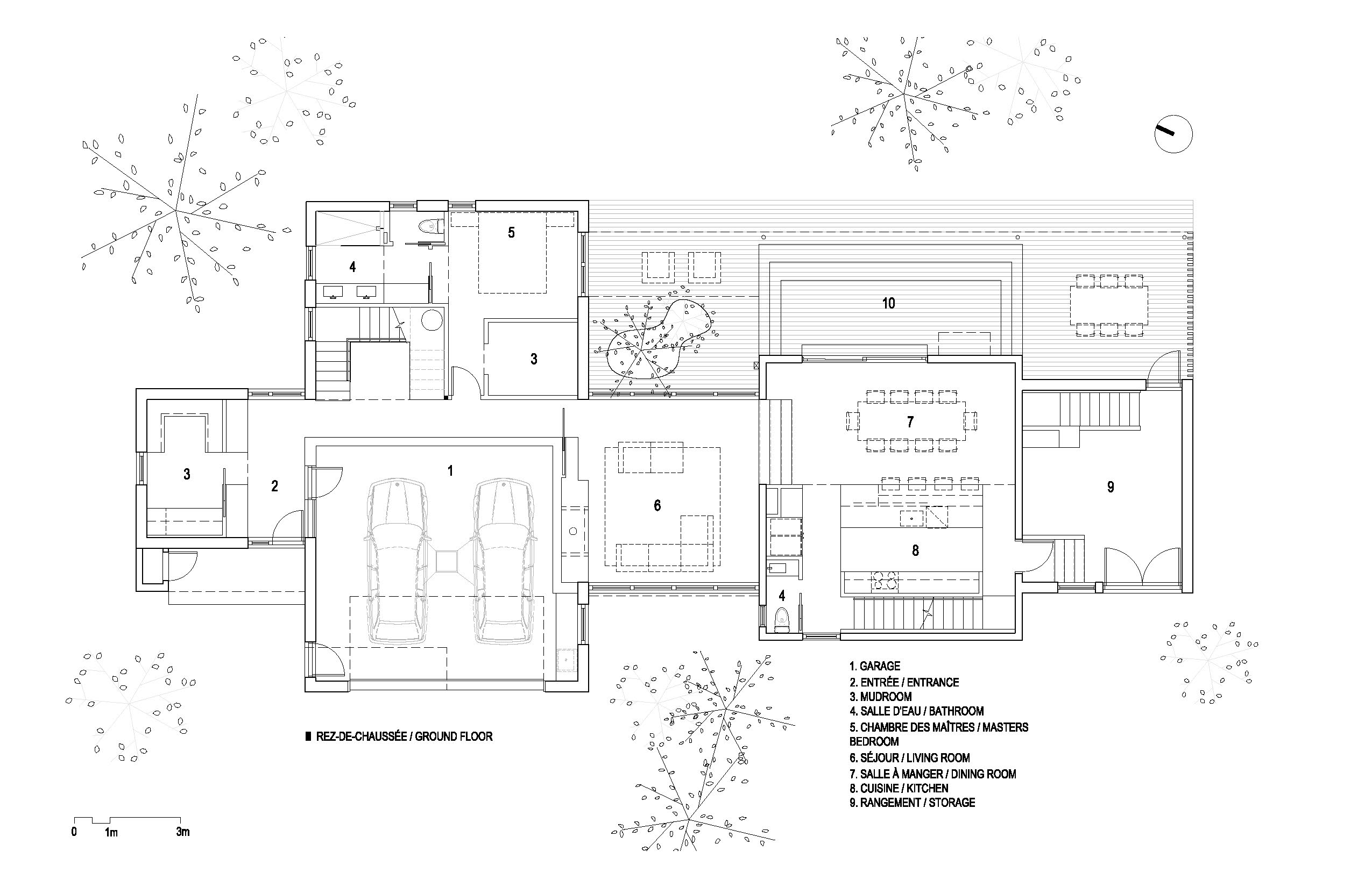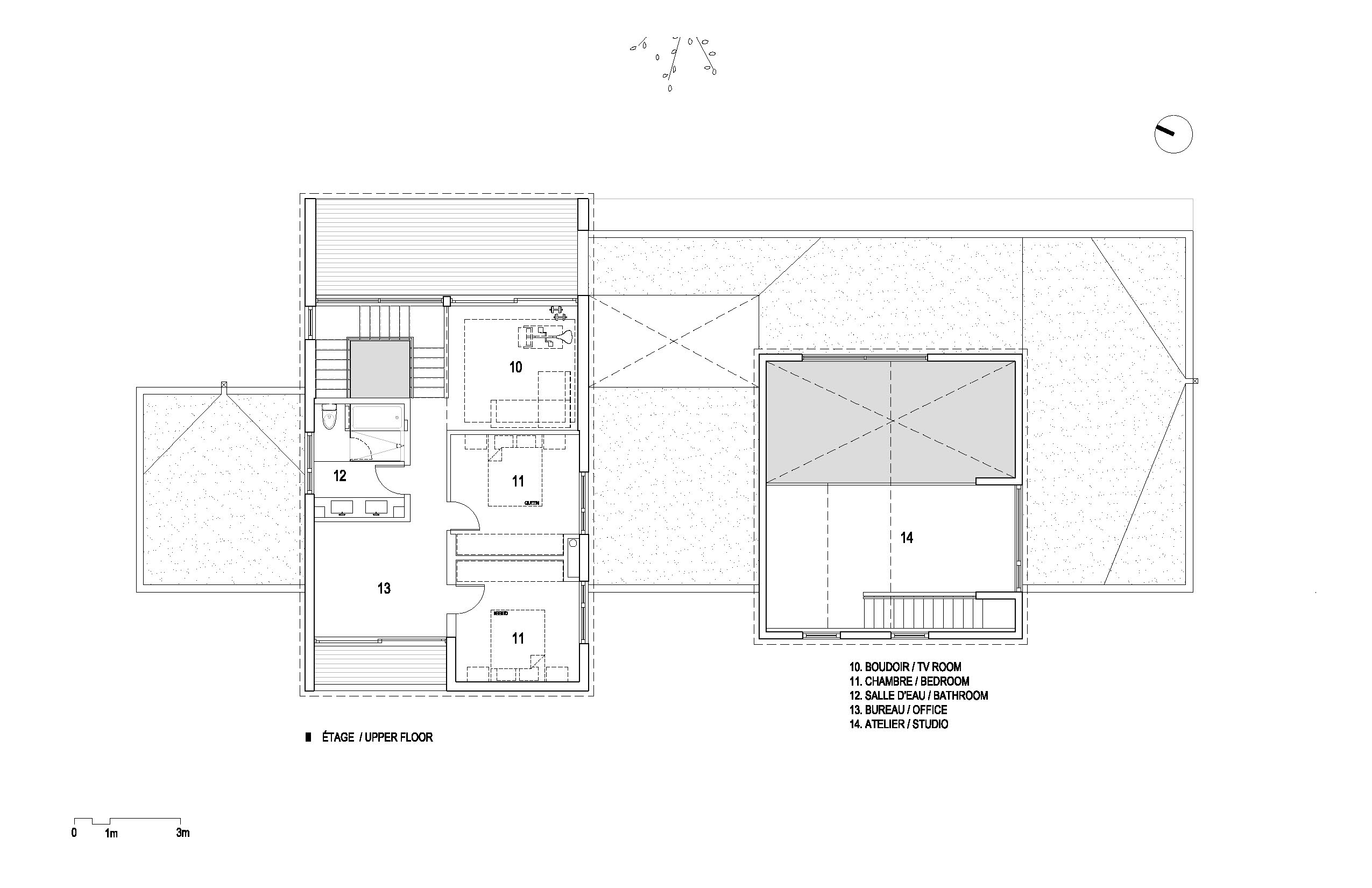 The extension becomes the private house and reproduces the roof slopes of the existing building, but with two full storeys. The ground floor integrates the garage and houses the main bedroom. Upstairs are the girls' quarters with, on one side, an office space overlooking the mountain and, on the other side, a boudoir and covered patio at canopy height. The cathedral ceiling clad in eastern white cedar cuts through the extension and over the exterior spaces, enhancing a transparency effect.