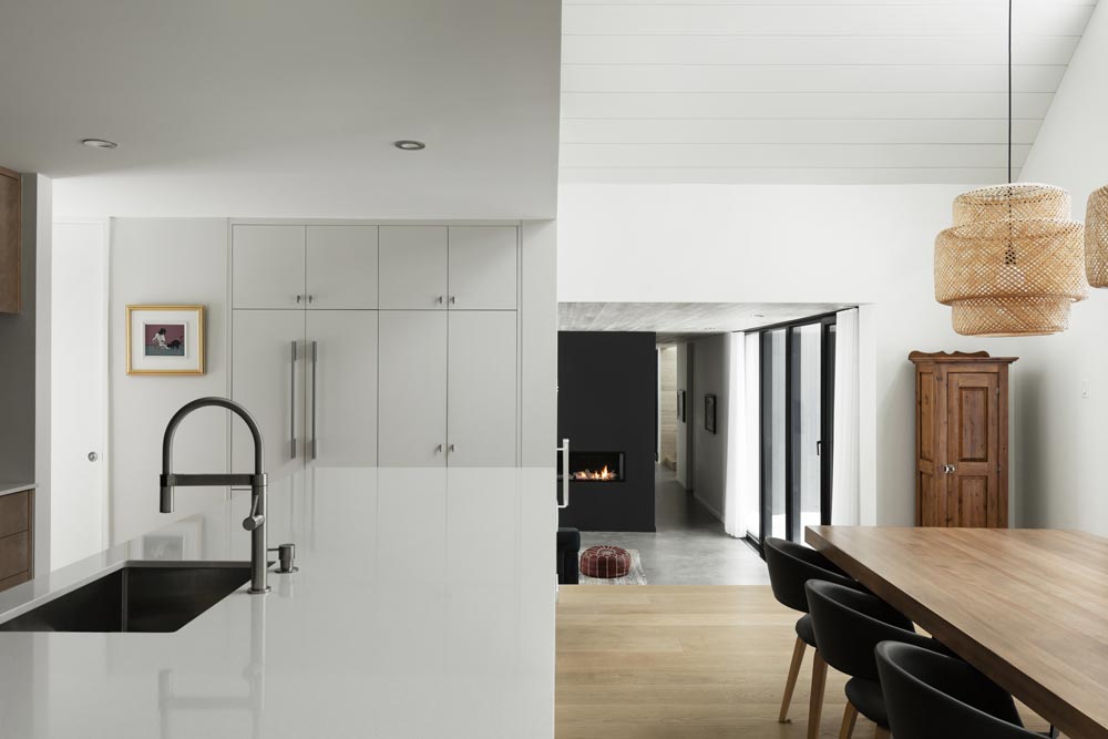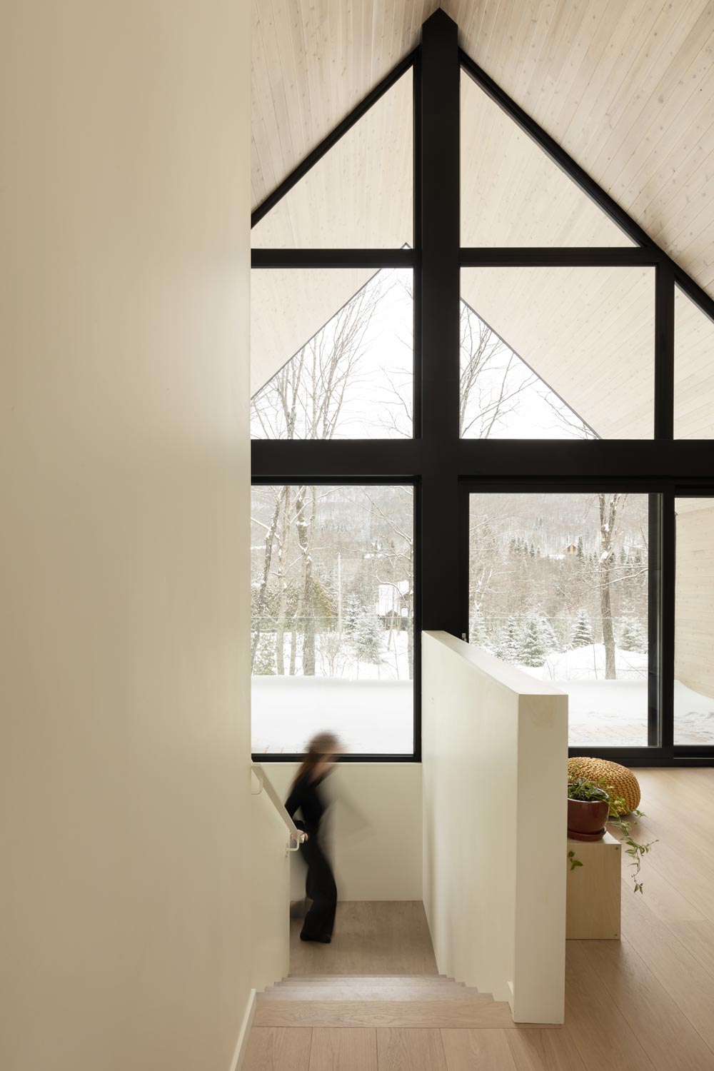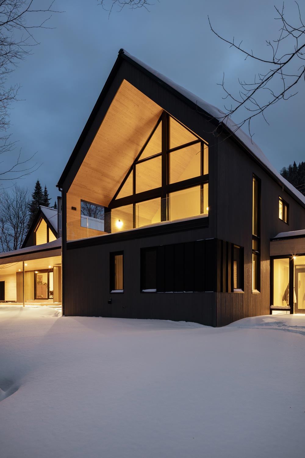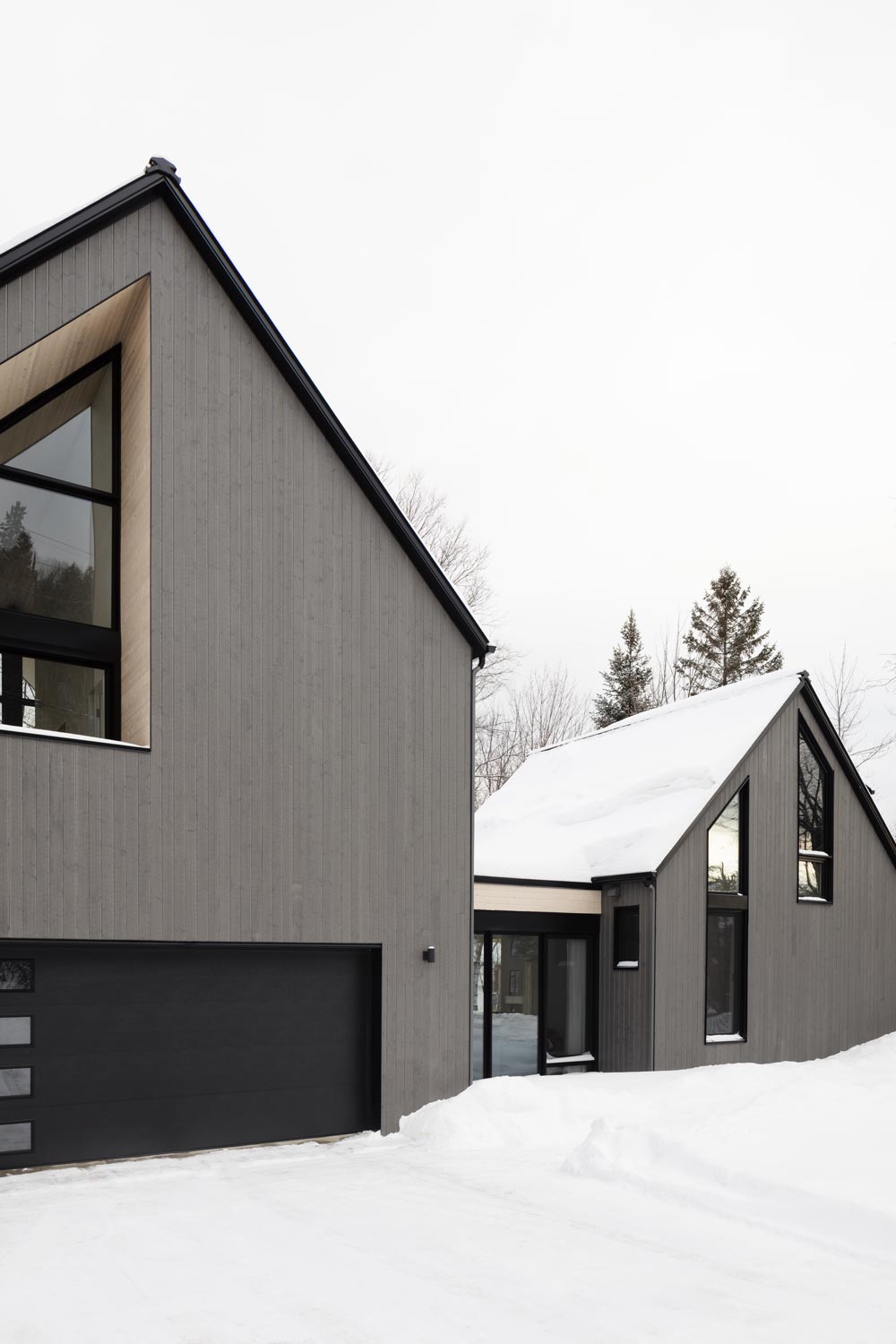The volume of the original cottage, saved and transformed, was the inspiration for the expansion. The addition of new openings, the choice of material and the attention to architectural details bring a contemporary touch to the project without distorting the past. The tradition/modernity balance can also be felt through the addition of the one-storey, flat-roofed, inhabited passageway. At the back, the roof stretches and partially covers a large patio. A tree planted at the heart of the project symbolizes a second life for this former ski cottage, and a fresh start for this new main residence.