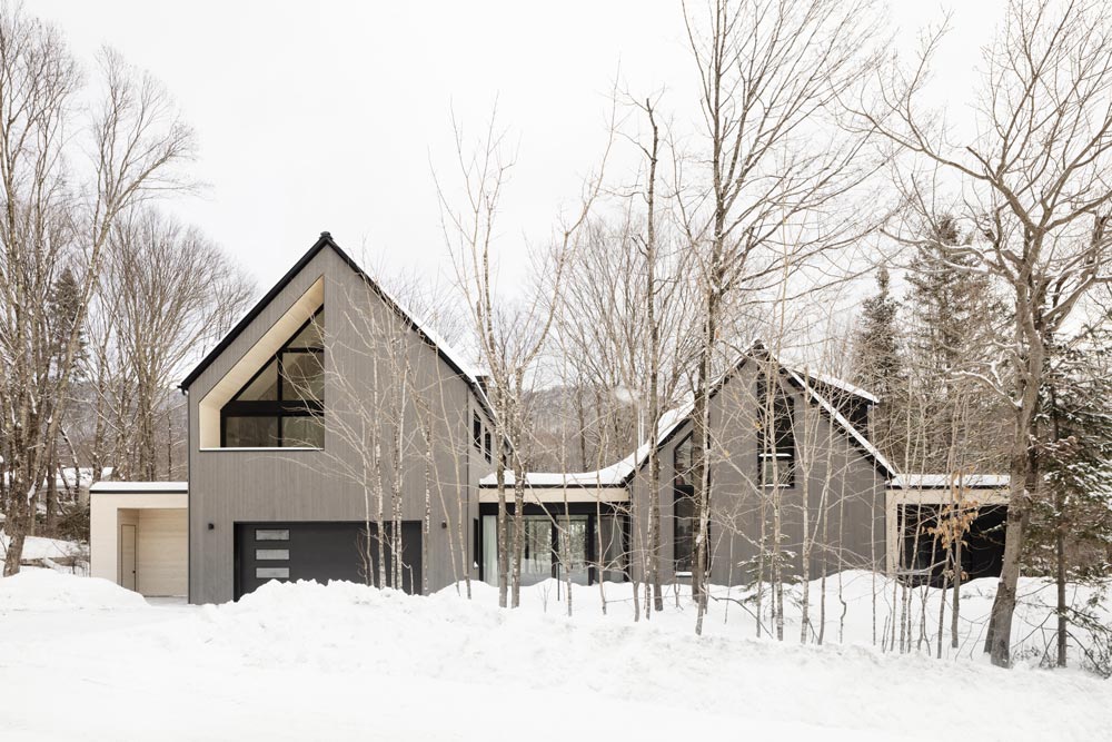 Located next to the slopes at Stoneham Resort, La Frangine is the result of the expansion and conversion of a former ski chalet into a main residence. The architectural part of the project consisted in keeping the existing cottage and to design a second separate building connected to the first one. Like a big sister, the new section looks after the smaller one. Both buildings nicely connect by means of a glass passageway which allows natural light into the heart of the residence. From its façade, the building echoes the dimensions of the original cottage but extends deeper into the deciduous forest. This creates an intimate deck located at the back of the house.