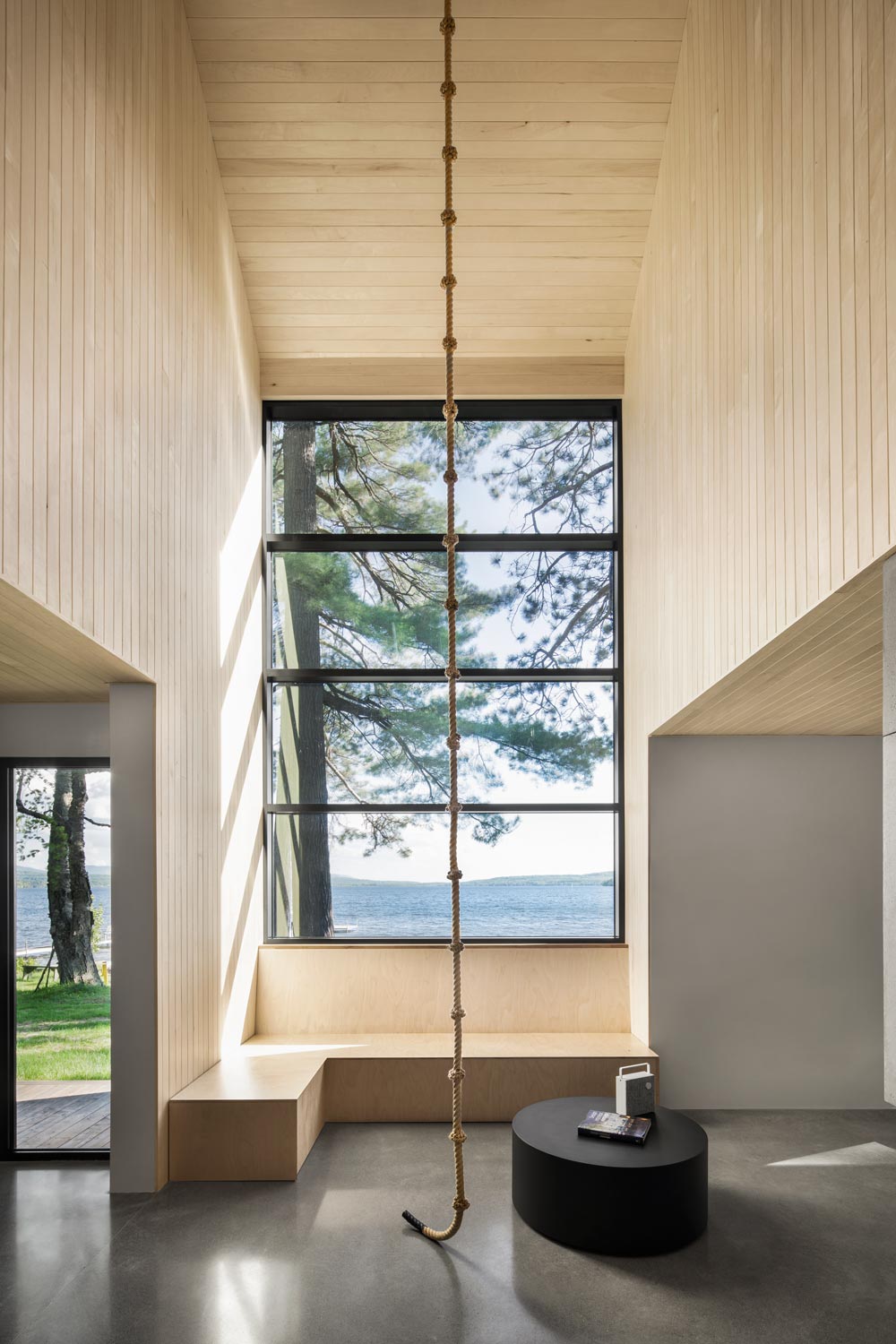 The cabin is centered around an atrium that opens to the outdoors. The design was developed around a fireplace set beside a triple-height area that makes it visible from everywhere within the cabin thus generating a canyon of hospitality. Located in the center of a concrete slab floor on the ground floor, it divides the open space into areas of various spatial qualities. On both sides of the canyon, glazed walls offer views on the outdoors. Traversing the canyon on the second floor is a bridge that creates more common space. Four bedrooms open onto the bridge.