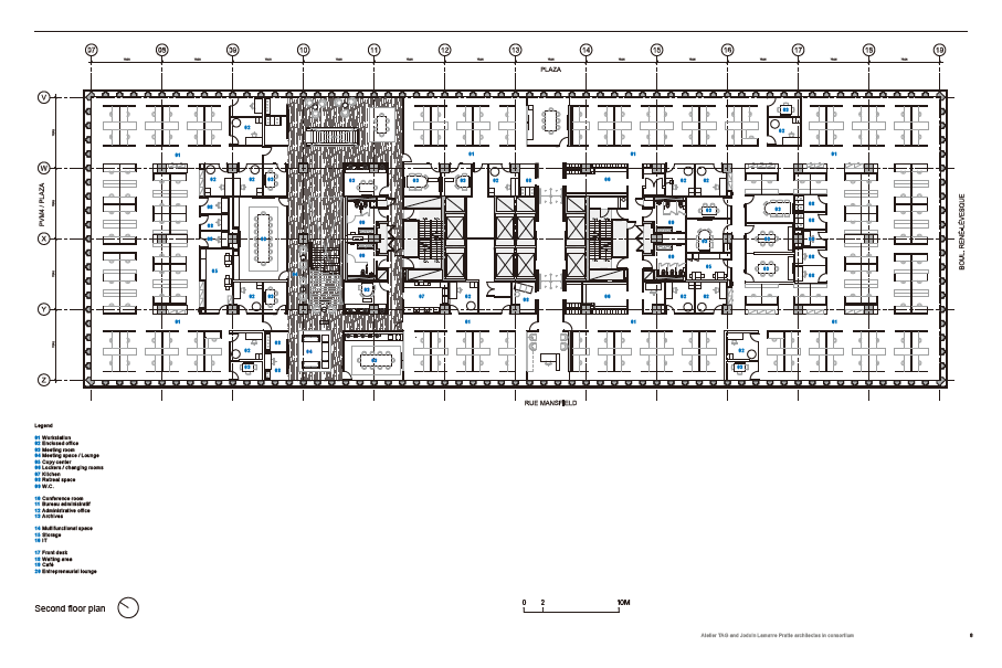 현대 시대의 유산인 오피스 타워는 일반적으로 층간 연결이 거의 없는 일련의 수평 공간으로 구성된다. 7개 레벨에 BDC를 배치하는 것은 넓고 밝고 수직으로 상호 연결된 협업 작업 공간을 정의하는 대안 시스템을 제안할 수 있는 기회였다. 이중 높이 공간과 내부 계단 연결의 도입은 직원에게 일상적인 이동 수단이 되고, 다른 부서를 연결한다. 또한, 다양한 사회 활동을 지원하는 수직축을 통해 결합된다. 사회 공간적 장치로 편성된 새로운 건축 계단은 BDC의 지리적, 사회적, 상징적 핵심이 된다. 모임과 우연의 만남의 장소로서 계단은 층에서 층으로 펼쳐지고 각 부서의 고유한 프로그램적 요소를 고정시킨다. 타워 내 위치에 따라 부서의 사교성을 변화시키며, 1층의 공공 프로그램에서 6층의 집중 작업에 적합한 공간으로 이동할 수 있다.