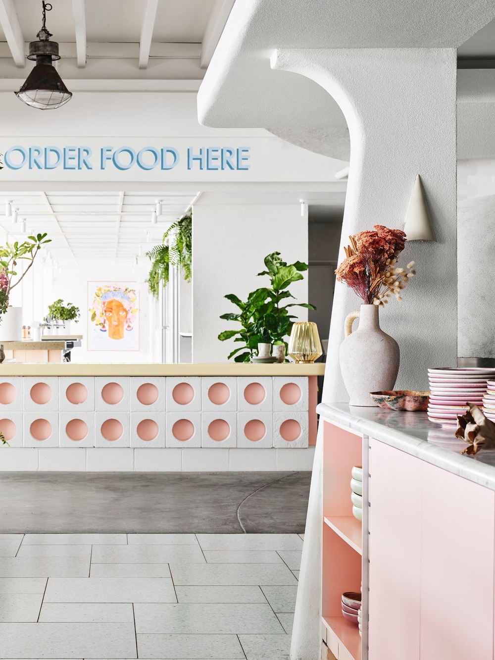 From this kitchen, the three portions of the venue radiate; an unobstructed 50-meter expanse of oceanfront view looks North to the Gold Coast and South to the Burleigh beach point break. The Tropic restaurant marks itself clearly with its rattan ceiling, crazy paved floor and pink and brass highlights. A coastal brasserie; this is the sexy older sister to the main beach bar and Pavilion terrace bar. The Pavilion bar to the south is an open expanse with painted concrete block detailing and ample seating. High bar seating cascades down to the tiled window nooks which perch over the water's edge. The main beach bar has in scale and simplicity what the Tropic has in detail and intimacy. It is a vast open volume with expressed structures, views in every direction and robust energy underneath an umbrella canopy.