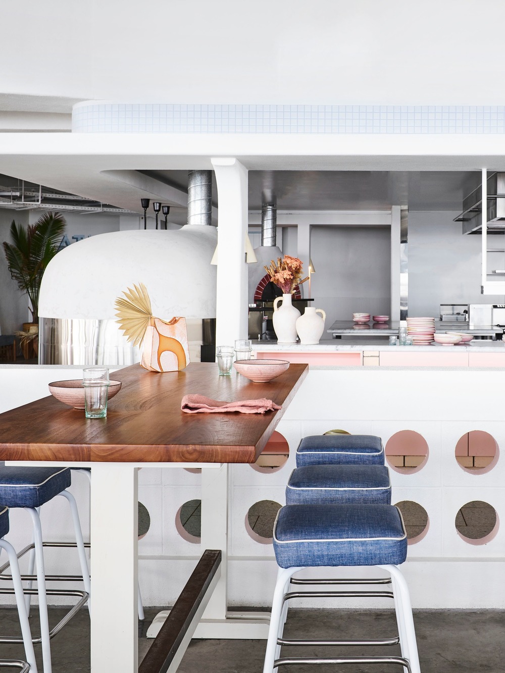 Inside, a large central open kitchen with two pizza ovens and a fire pit pushes patrons toward an ever-reaching view where various furnishings encourage them to eat, stand and drink. It is a hive of gastronomic energy built within a curving masonry arbor, a nod to past pavilion structures once dotted up and down the coast.