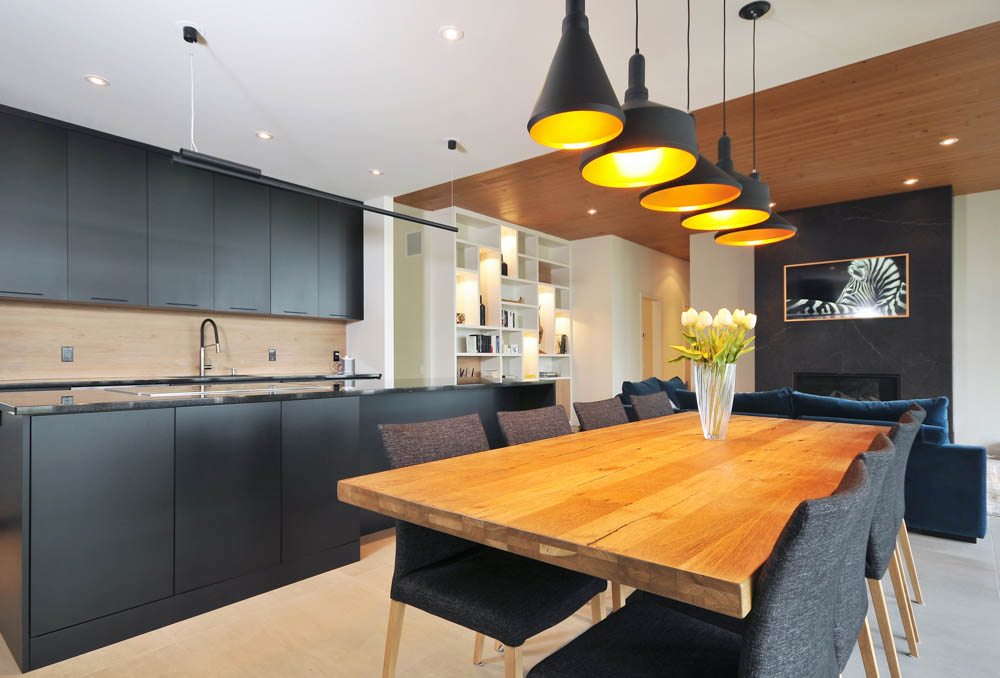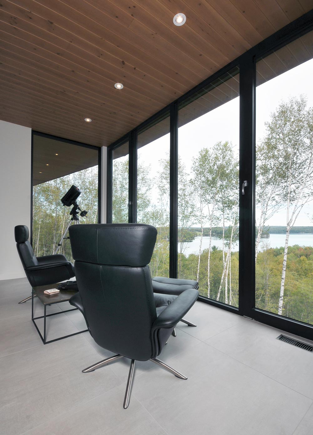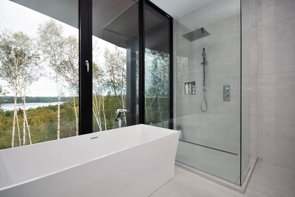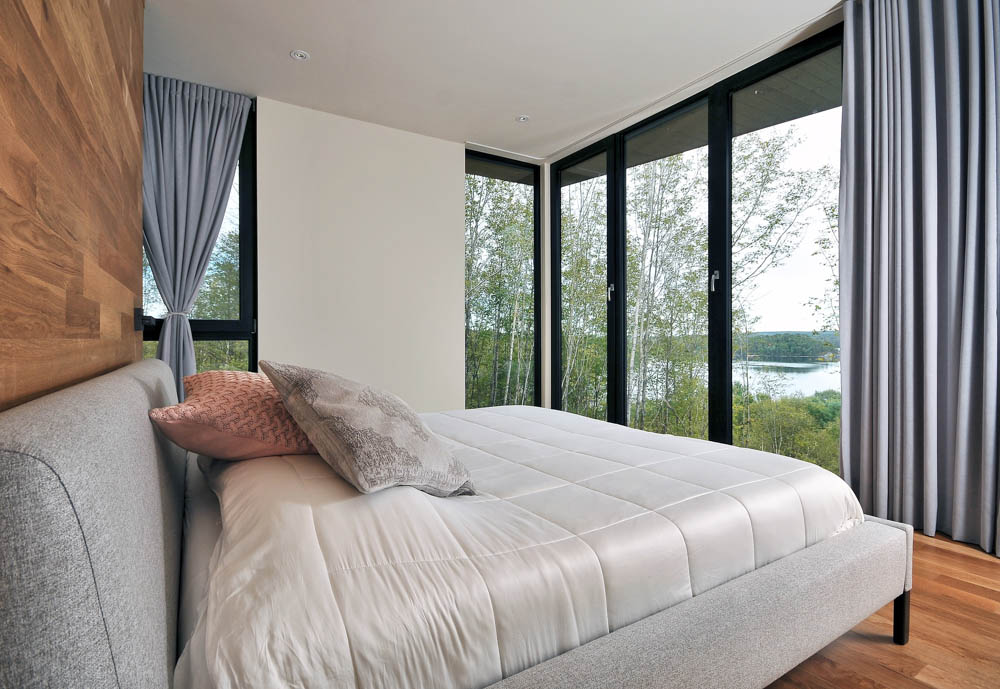 ESPACE VITALs team imagined a house that takes advantage of the natural grade of the site which allowed the owners to occupy the same level as the entrance. This floor houses the main living areas (the living room, the dining room and the kitchen, all in an open layout) as well as the master bedroom (a generous space that also includes a walk-in closet and an in-suite bathroom). All those spaces feature floor to ceiling windows. Also fully glazed because of the slope, the lower level houses two guest rooms, a full bathroom, a living room and a gym. Everywhere in the house, circulation is fluid and space is optimized by avoiding long corridors. On the inside as well as on the outside, wood was favored to bring warmth to the clean lines. But above all, in all the rooms, even in the bathrooms, the view is breath-taking. The clients were seduced by a house featuring a huge suspended bay-window, like an observatory, seen in ESPACE VITALs portfolio.