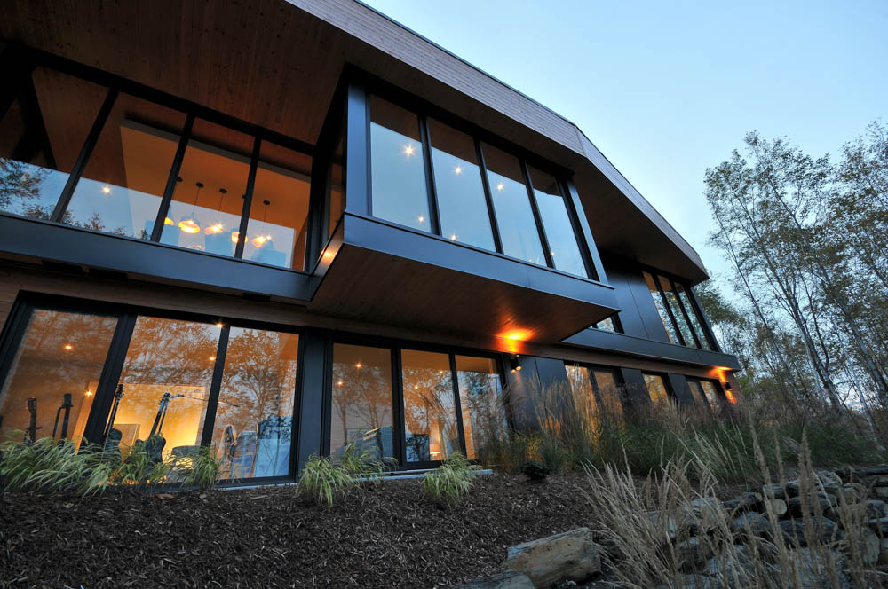 ESPACE VITALs team imagined a house that takes advantage of the natural grade of the site which allowed the owners to occupy the same level as the entrance. This floor houses the main living areas (the living room, the dining room and the kitchen, all in an open layout) as well as the master bedroom (a generous space that also includes a walk-in closet and an in-suite bathroom). All those spaces feature floor to ceiling windows. Also fully glazed because of the slope, the lower level houses two guest rooms, a full bathroom, a living room and a gym. Everywhere in the house, circulation is fluid and space is optimized by avoiding long corridors. On the inside as well as on the outside, wood was favored to bring warmth to the clean lines. But above all, in all the rooms, even in the bathrooms, the view is breath-taking. The clients were seduced by a house featuring a huge suspended bay-window, like an observatory, seen in ESPACE VITALs portfolio.
