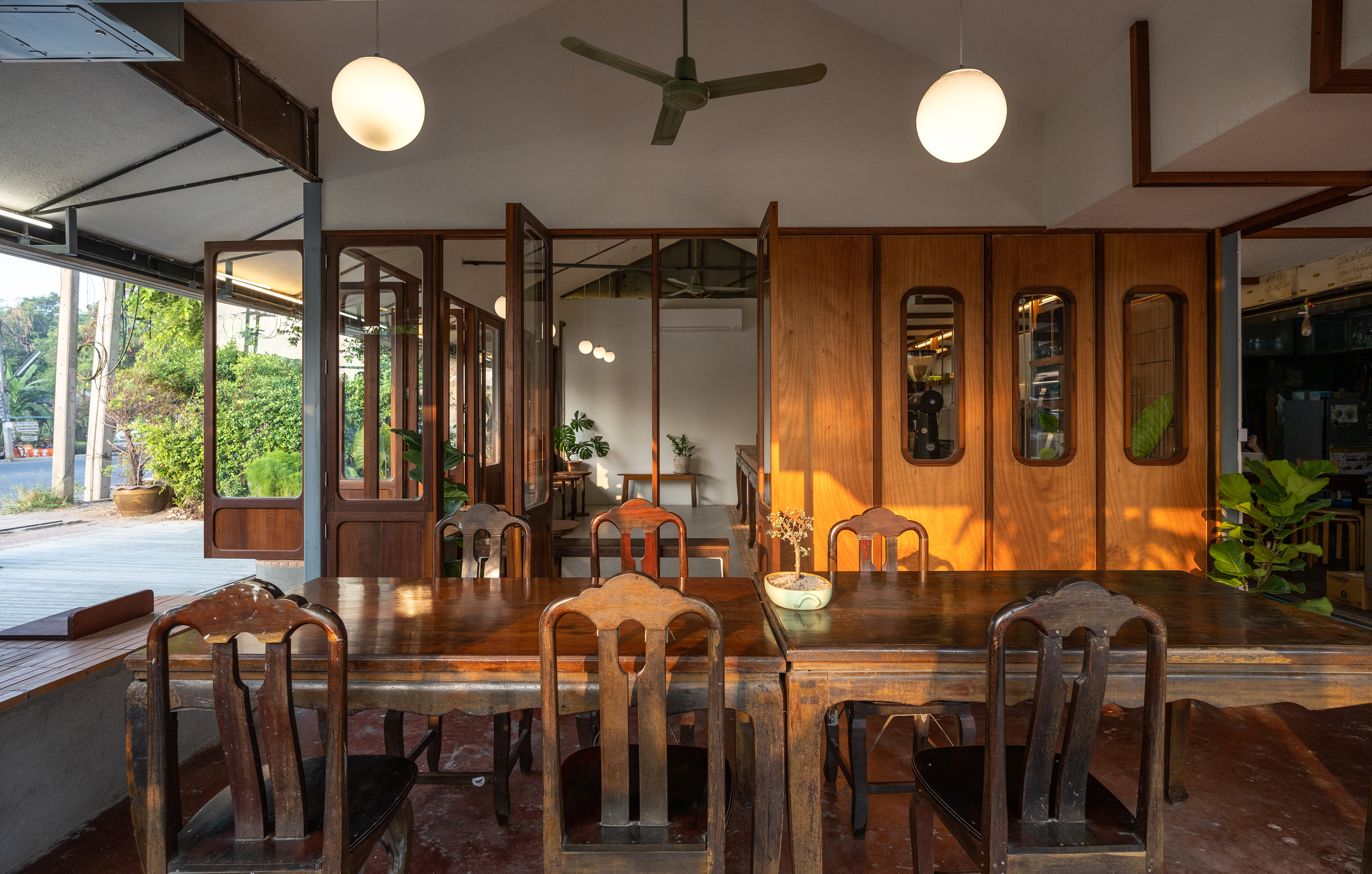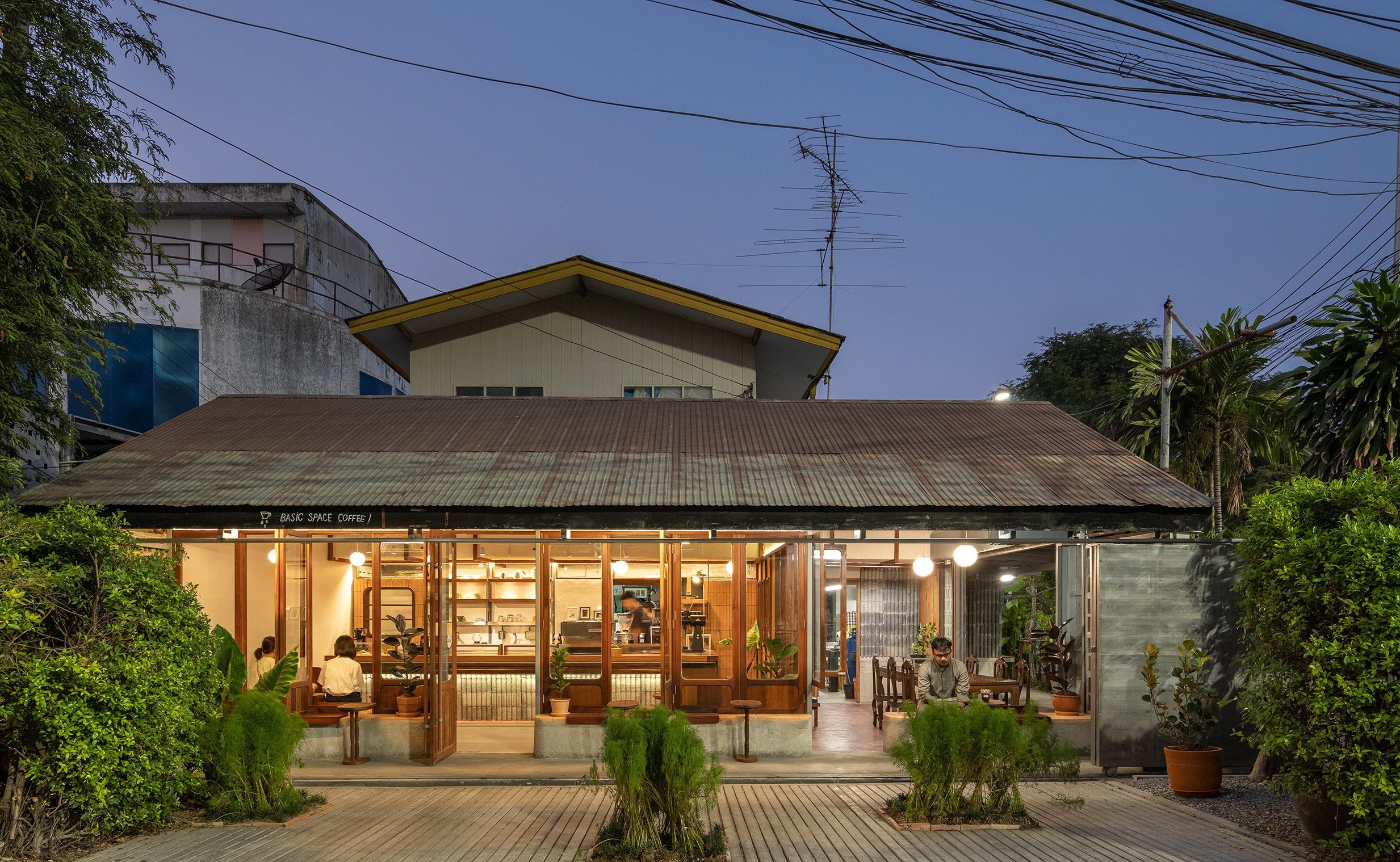 The design of 'Basic Space Coffee' is the simplest interpretation of space design in the form of Basic Space to meet the use of many generations can access the atmosphere and share the space in harmony. The exterior frames of the building, such as the roof trusses and roof materials, were preserved because they were the first photos of the store. The designer chose to let the change begin with the interior space. By changing the original flat ceiling to be a slope ceiling along the gable roof. To add dimensions in the vertical axis to make the shop area looks more airy. Revealing the original structure of the building and select the context of the original parts. It represents a successful piece in the restaurant era as well. Meet the needs of the owner who wants to keep it ‘Kha-sing wooden table’ is thus welcomed in the most important role, such as a coffee bar. These are the table sets that the parents of each house bought. Therefore, it is also a piece of memories of many people. The cafe itself is surrounded by a set of wooden doors and windows to the furniture that hides the line details that are the same as the Kha-sing wooden table sets.