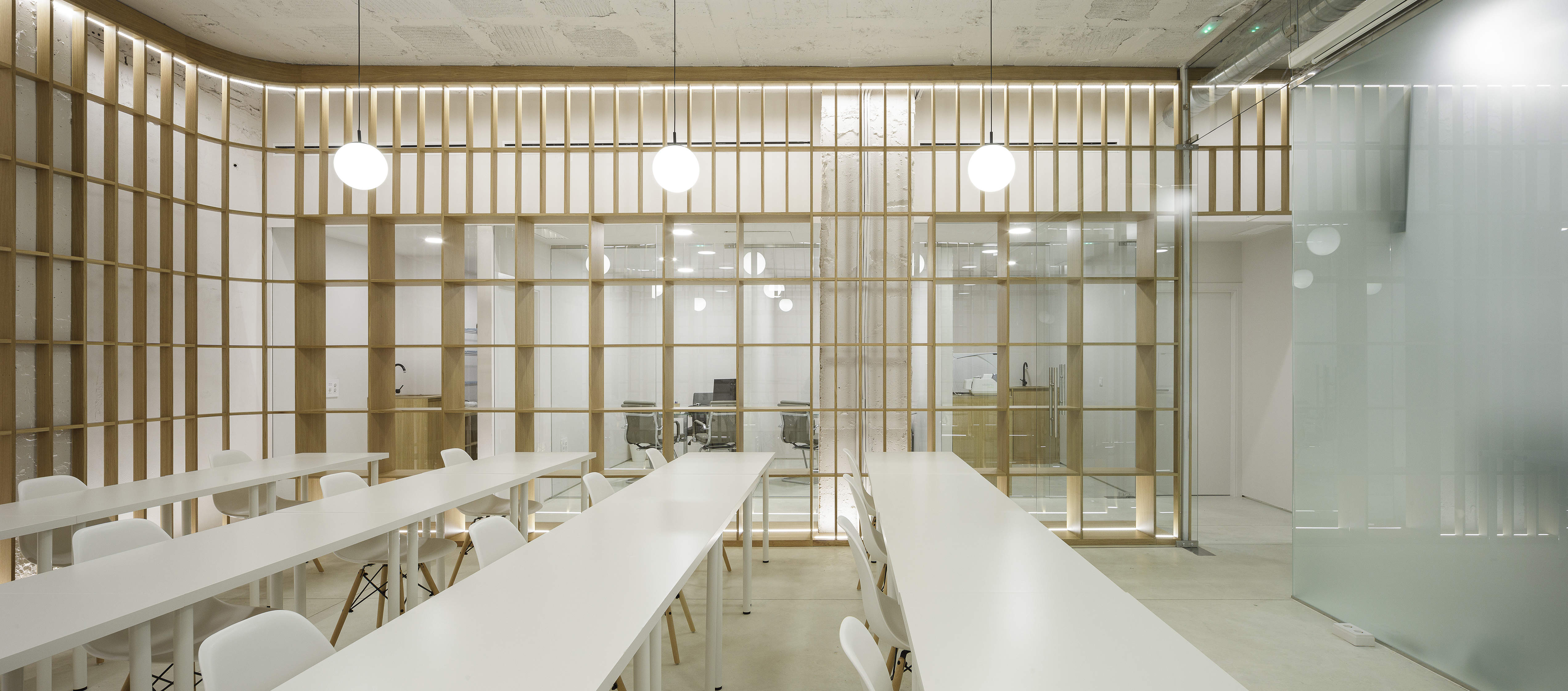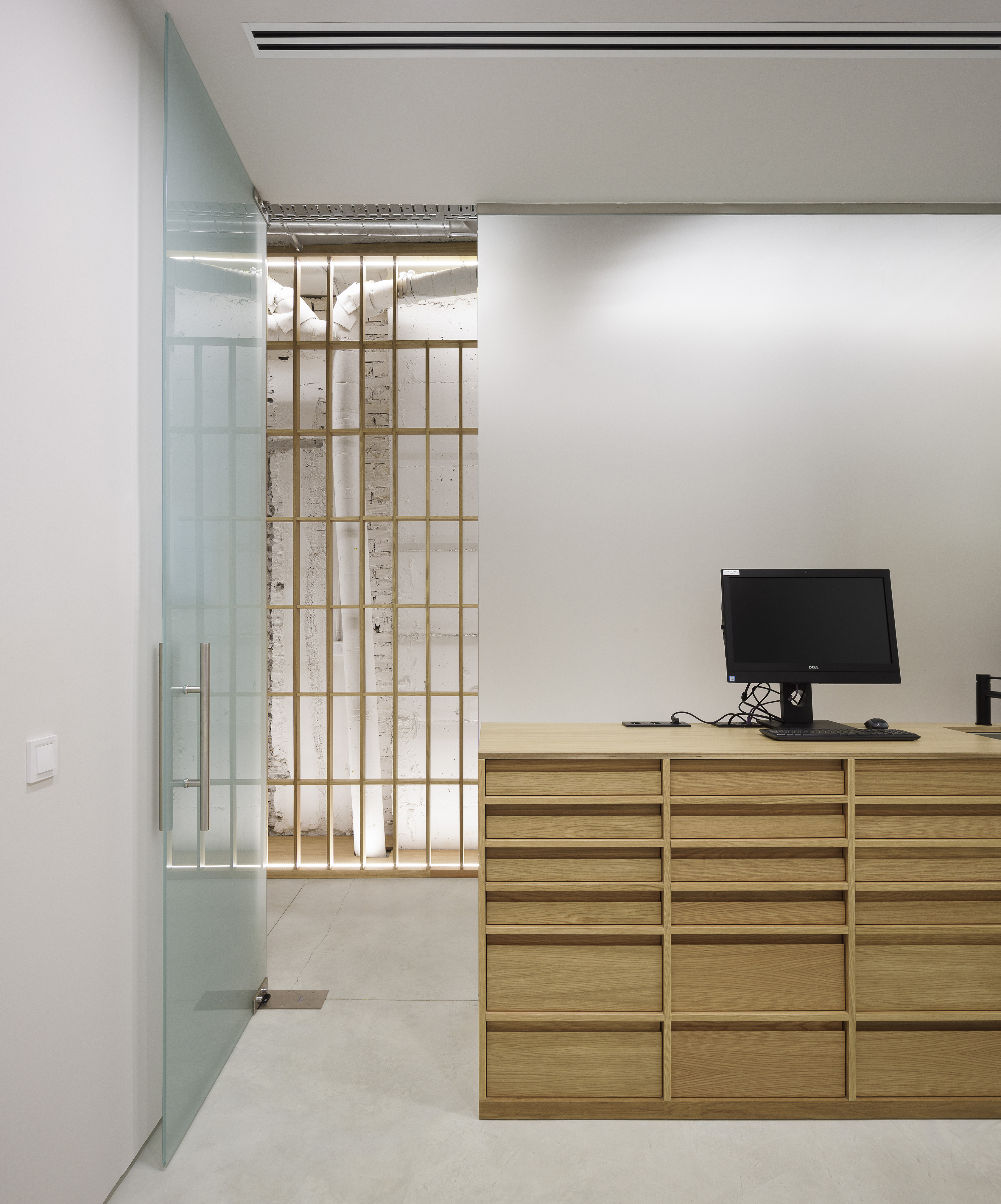 이 공간은 상점 전면과 후면의 창을 통해 자연 채광에 접근할 수 있다. 이를 염두에 두고 프로젝트는 전체를 덮지 않고 다양한 재료의 일련의 반투명 스킨을 겹쳐놓는다. 이 레이어들은 각 방이 필요로 하는 다양한 수준의 자연광과 프라이버시를 조절한다. 한편으로는 오크 나무 격자가 공간의 메인 베이 전체 둘레를 덮고 있다. 격자는 기준치, 선반, 서랍, 스크린 및 리셉션 데스크와 같은 모든 로컬 프로그래밍 요구 사항을 해결할 수 있는 직교 그리드를 설정한다. 이 규칙적인 요소는 자연 채광과 시각적 연결을 허용하면서 클리닉의 내부 공간을 균질화한다. 또한 기존 건축 프레임의 불일치를 부분적으로 보여준다.