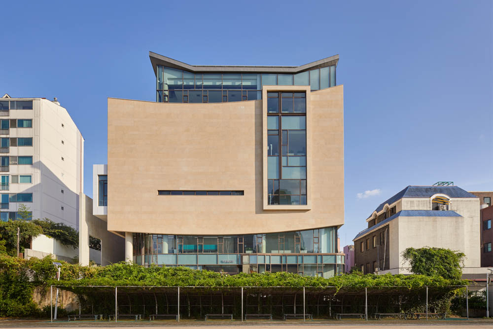 The authoritative shape of the steeple was determinedly abandoned, Gaepodong Church was amiably built within the city by choosing a familiar and soft shape as well as warm exterior materials. When the upper volume was lifted to facilitate access to the parking lot, unique V-shaped pillars that help the cantilever was applied. This is not only an effective structural solution, but also a symbol that shows the architectural characteristics of the inflow of open values under the lifted volume.
