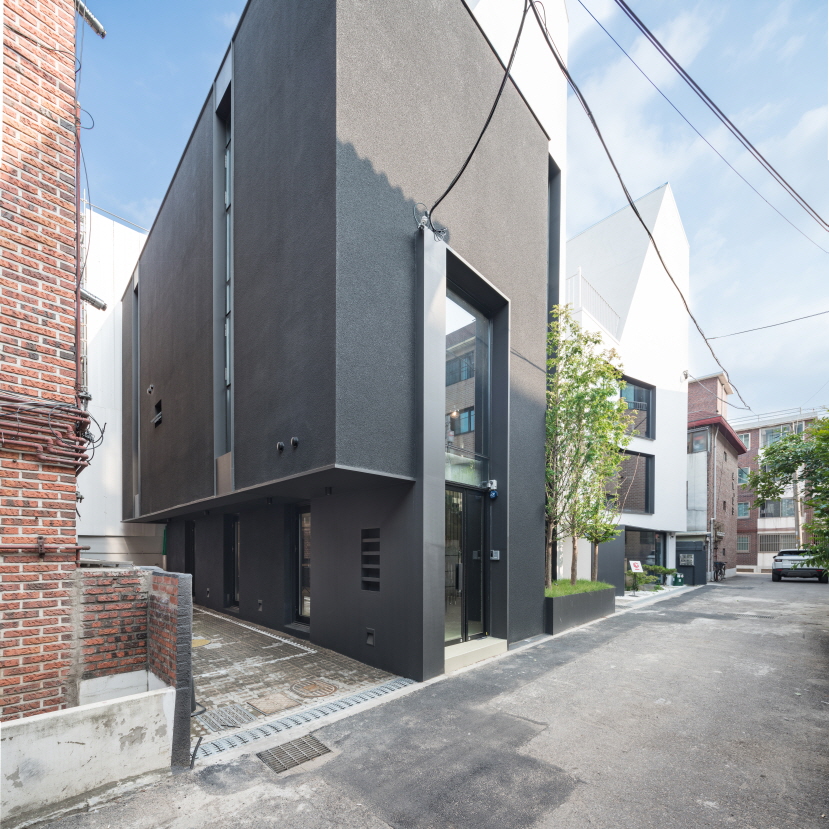 개발 붐으로 오래된 동네에 새로운 건축물들이 들어오고 거리가 들썩인다. 계획 대지는 주 가로에서 조금 떨어진 골목에 있다. 프로젝트 진행 직전, 옆 대지에 흰색의 건축물로 거리 풍경 변화의 첫 단추가 꿰어지자, 주변 필지의 소유주들 역시 신축하려는 분위기가 조성되는 상황이었다. 이러한 분위기에서 서로 튀려고만 한다면 난개발이 될 것이 뻔했다. 골목 풍경을 조금이라도 덜 망치는 방법은 형태를 단순화 하고 주변 건축물과 조화를 꾀하는 것이라 생각했다. 상업 건축물의 특성상 돋보여야 하기 때문에 과감하게 옆의 흰색 건축물과 비슷한 형태와 색채로서 건축물이 더 커 보이도록 착각하게 하는 전략을 구상했다. 군집의 힘은 분명히 개별 보다는 강하기 때문이다.