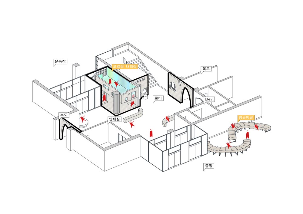 강명초등학교의 로비는 모든 학생들이 등하교, 체육시간, 점심시간 등 하루에 최소 3~4회 지나쳐가는 공간이다. 로비는 학교에 들어오는 첫 인상이자 마지막 인사이다. 또한 가장 많이 지나쳐가는 큰 복도이자 교차점이 많은 머물러 쉬어가고 싶은 공간이기도 하다. 이러한 사용빈도와 사용자의 수에 비해 공간이 협소해 특별한 기능을 담기는 어려웠다. 딱딱한 화강석 물갈기 바닥과 어두운 조명, 버려진 화단이 차지하고 있었고, 쉬어갈 곳은 3인용 소파가 전부였다. 이 곳은 오픈된 공간이지만 생각보다 많은 역할을 하고 있었다. 메인 계단과 엘리베이터홀 양쪽 복도가 모두 모이는 곳이고, 쉬는 시간에 부모님에게 전화하려고 줄을 서는 전화기가 있는 곳이었고, 비록 3인용 소파이지만 유일하게 편히 쉴 수 있는 의자가 있는 곳이었고, 체육시간에 외부수업을 나가기 전에 전체 학생이 정렬을 하는 곳이었다. 이러한 기존의 기능을 존중하고 이에 아이들이 원하는 기능을 담내는 방법을 고민했다. 기존의 동선을 최대한 존중하고 한 반 학생들이 한번에 정렬할 수 있는 공간을 비워두며 무엇보다 학생들이 가장 원하는 놀 수 있는 로비, 앉을 수 있는 로비가 되어야 했다. 따라서 기능을 담기 위한 공간의 구획보다 기능을 유도하는 오브젝트로 디자인하고 그 오브젝트가 놀이를 유도하길 바랬다.