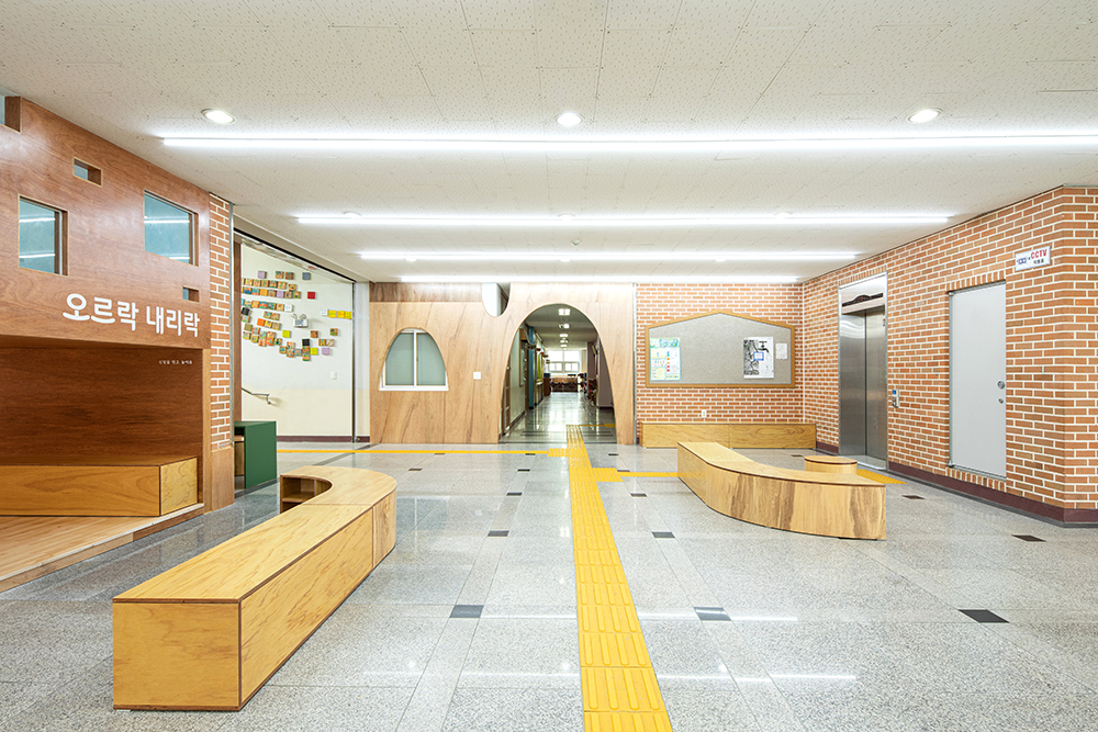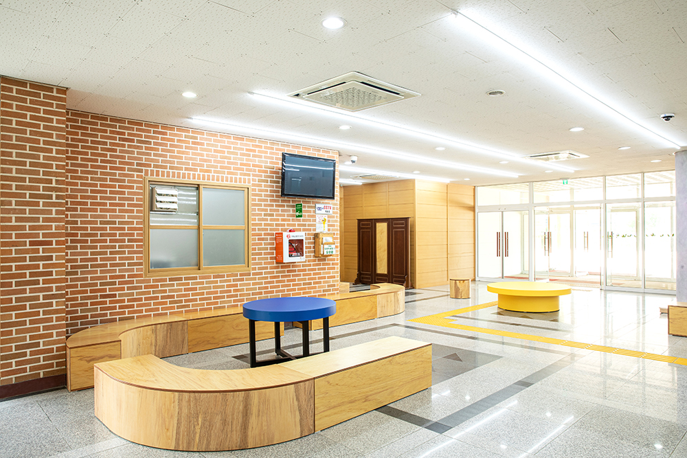 The lobby of Gangmyeong Elementary School is a space where all students pass by at least three to four times a day, when going to and from school, gym class, during lunch break, etc. The lobby is the first greeting upon entering the school, and the last greeting. Furthermore, it is a large hallway that is passed by the most, as well as a space with many intersections where many want to stay and take a rest. It was difficult to contain special functions as the space was small compared to such frequency of use and the number of users. The space had polished hard granite floors and dark lighting. Also, it was occupied by abandoned flower beds and the only place to rest was a three-seater sofa. Despite being an open space, it played more roles than expected. It was the place where the main staircase and both sides of the elevator hall met, the place where the phones to wait in line and call parents during break time were located, the place with the only comfortable chair, albeit a three-seater sofa, and the place where all students lined up before leaving outside for gym class. We thought about how to respect such existing functions and also contain the functions that children wanted. The lobby had to be a lobby with some space for students of one class to line up while respecting the existing circulation as much as possible, and most of all, it had to be a lobby where students could play and sit, which was what the students wanted the most. Therefore, rather than dividing the space to contain functions, the space was designed using objects that induce the functions, and we we hoped that the objects induced play.