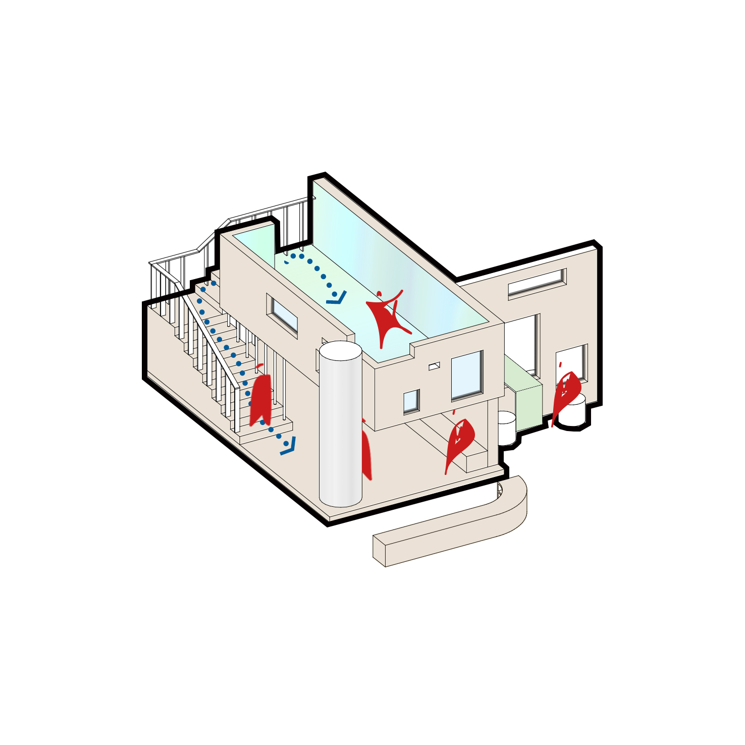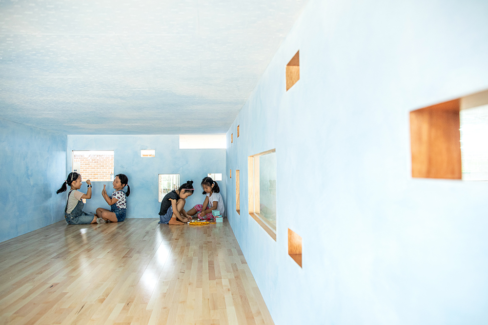 우선 버려진 화단 대신 아이들이 신발을 벗고 천정이 낮은 2개층의 공간을 오르락 내리락하며 사용할 수 있는 놀이공간으로 계획했다. 2층 내부는 천연페인팅 작가의 작품으로 하늘의 상징하는 파란색 계열의 색상으로 도장을 했고, 벽체에 다양한 크기의 오프닝을 통해 아이들의 시각적인 호기심을 자극하고자 했다.