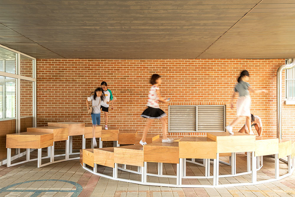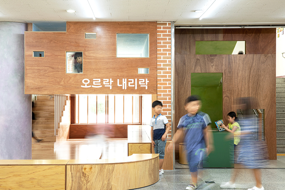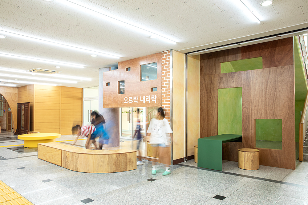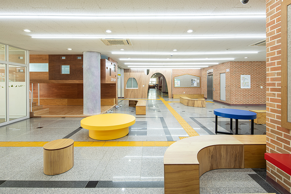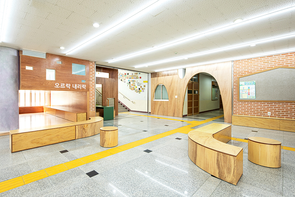 The lobby of Gangmyeong Elementary School is a space where all students pass by at least three to four times a day, when going to and from school, gym class, during lunch break, etc. The lobby is the first greeting upon entering the school, and the last greeting. Furthermore, it is a large hallway that is passed by the most, as well as a space with many intersections where many want to stay and take a rest. It was difficult to contain special functions as the space was small compared to such frequency of use and the number of users. The space had polished hard granite floors and dark lighting. Also, it was occupied by abandoned flower beds and the only place to rest was a three-seater sofa. Despite being an open space, it played more roles than expected. It was the place where the main staircase and both sides of the elevator hall met, the place where the phones to wait in line and call parents during break time were located, the place with the only comfortable chair, albeit a three-seater sofa, and the place where all students lined up before leaving outside for gym class. We thought about how to respect such existing functions and also contain the functions that children wanted. The lobby had to be a lobby with some space for students of one class to line up while respecting the existing circulation as much as possible, and most of all, it had to be a lobby where students could play and sit, which was what the students wanted the most. Therefore, rather than dividing the space to contain functions, the space was designed using objects that induce the functions, and we we hoped that the objects induced play.