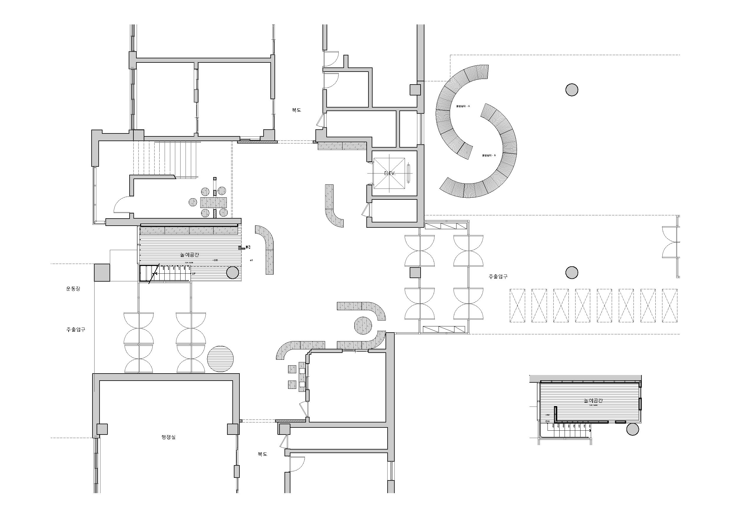 그리고, 로비 외부공간에 원형의 오르락내리락 Object가 또 하나 있다. 실제로 아이들이 원형의 놀이 object를 오르고 내리며 놀 수 있고 원형의 가운데 공간은 순서를 기다리거나 다른 놀이 공간으로 사용이 가능하다.