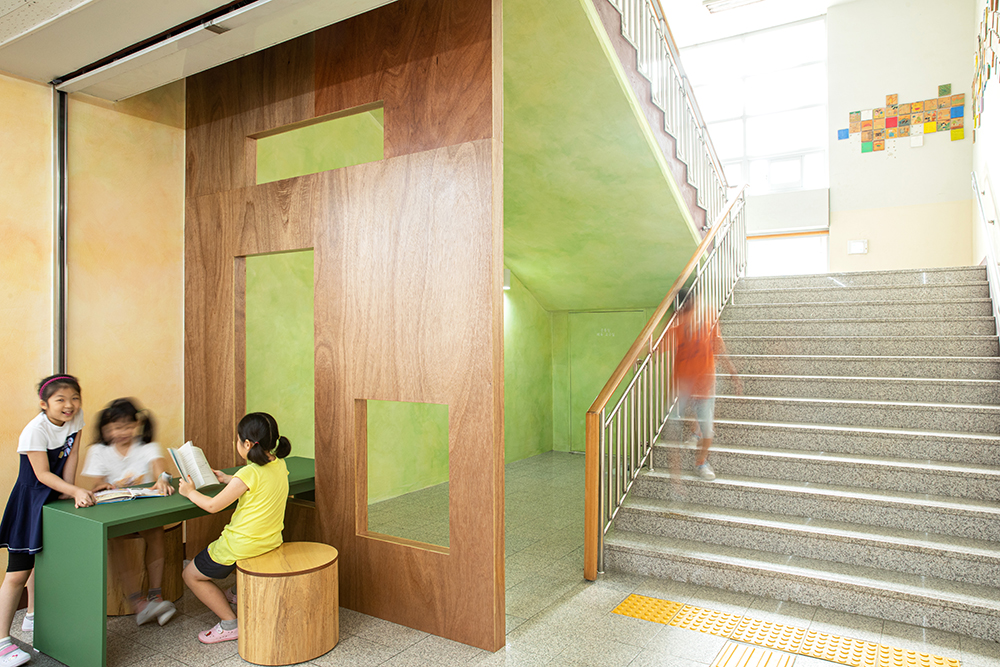 We hope that the various colors; the red phone shelf where the children make phone calls, the blue table in front of the bench, the yellow low bench where multiple students can sit or lie down, the green reading table at the lower area of the staircase, the sky blue color of the Up and Down space interior, and the green color of the lower staircase area, can contain the unique liveliness of children.