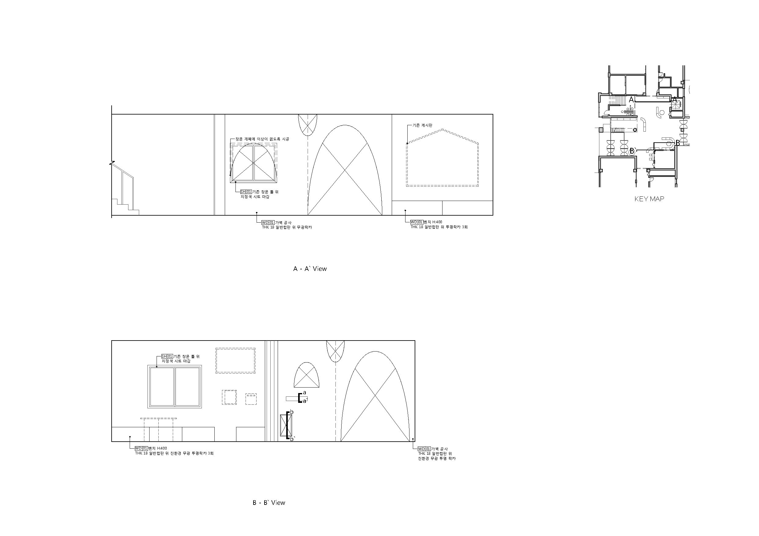 기존 로비가 삭막해 보이는 이유가 바닥은 화강석, 벽은 벽돌과 나무색상 시트, 천정은 흰색 텍스로 각각의 재료가 따로 존재하기 때문이기도 했다. 이에 바닥, 벽, 천정의 시각적 이음새 역할을 하는 양쪽 복도, 계단하부, 로비 곳곳에 놓일 가구들의 재료와 색상을 기존의 재료와 유사한 색상과 재질을 활용했다. 또한 양쪽 복도, 계단 하부와 같은 로비공간의 경계 역할을 하는 곳에 Skin 역할을 하는 벽체를 세워 로비공간 자체로 아늑한 공간감을 주려고 했다. 또한 창이 없는 다양한 형태의 오프닝을 활용하여 동선 및 시선이 통과할 수 있도록 하였다.
