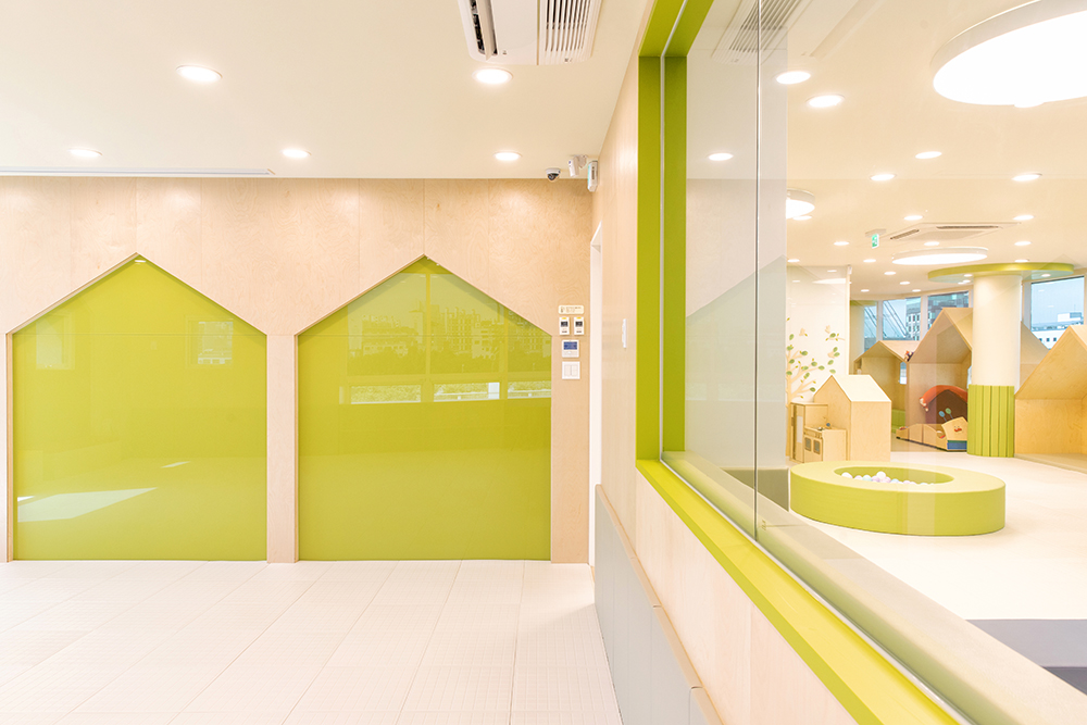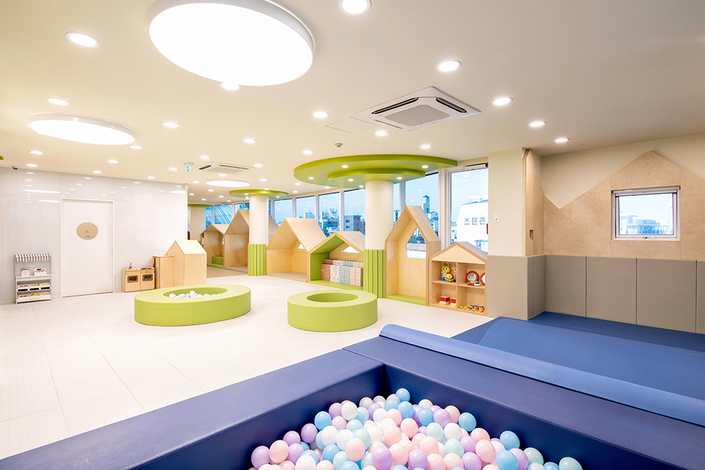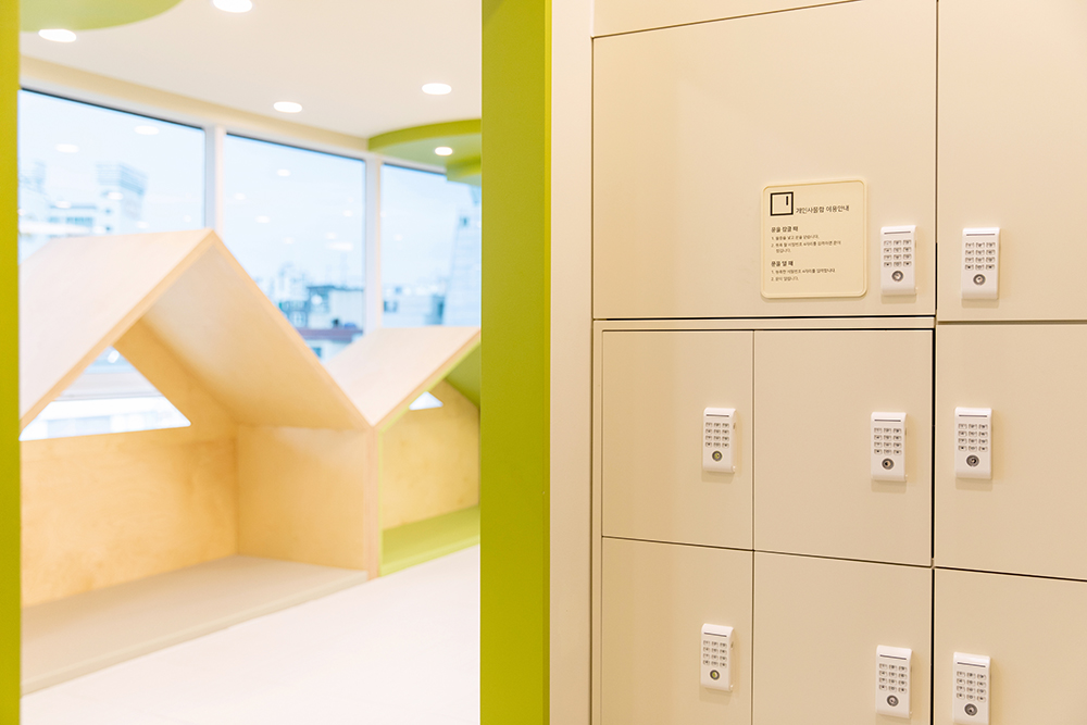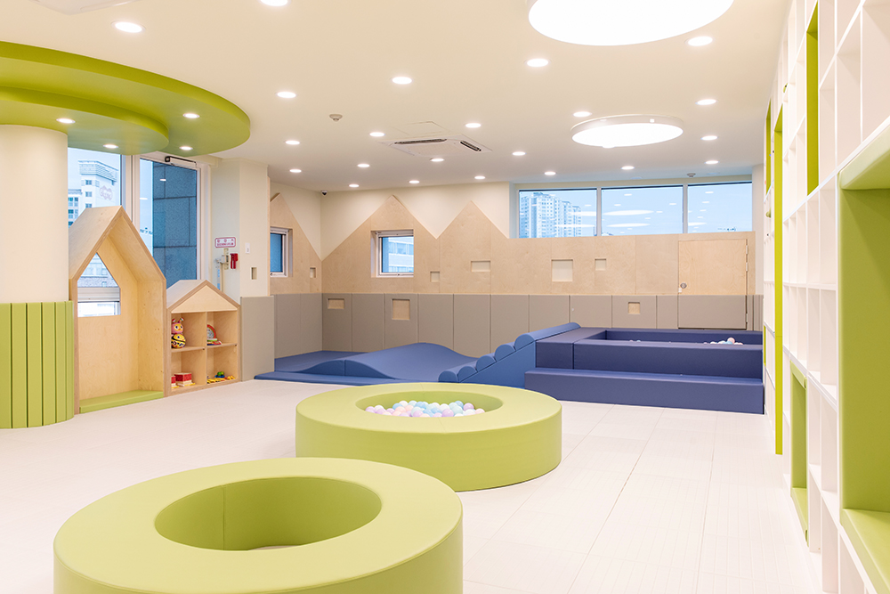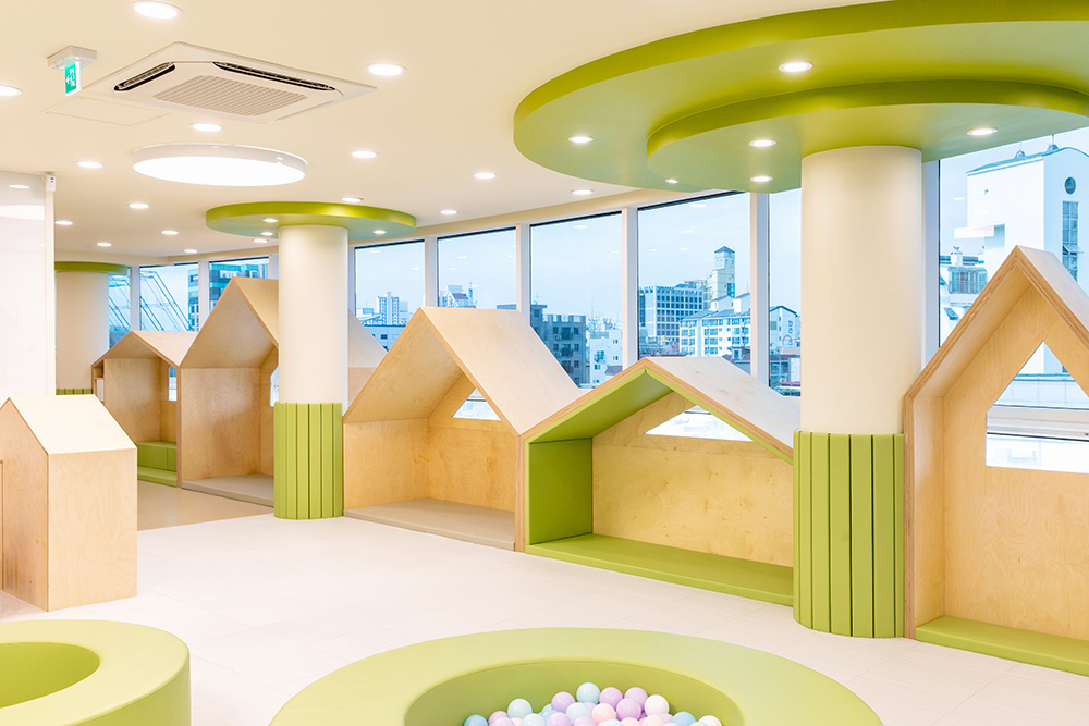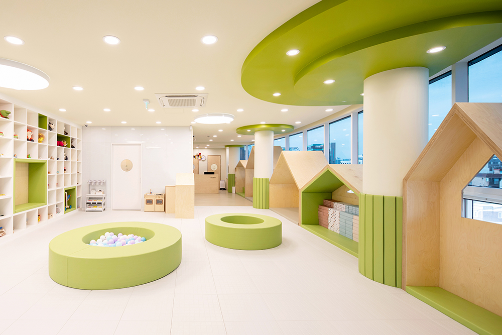 Imagine a scenery of the children playing, where there are trees around the playful children's houses and they can freely play among the trees. The columns between the houses portray trees, and circular structures that embody trees were also installed on the ceiling. The space also has a program room where independent programs can be run, a washing room where toys are washed and stores, a shoe cabinet, reception, meeting room and a nursing room. The overall atmosphere was created with the white color and wood of birch plywoods, and a bright green color and signs were used to highlight the space. The same was applied to the toy storage shelf that occupies the entire wall on one side, and for some of of the storage boxes, mats were installed to allow children to enter and play. We hope that it can become a public playground, where the playful children can play for as much as they want, as if playing comfortably at home rather than consuming a space.