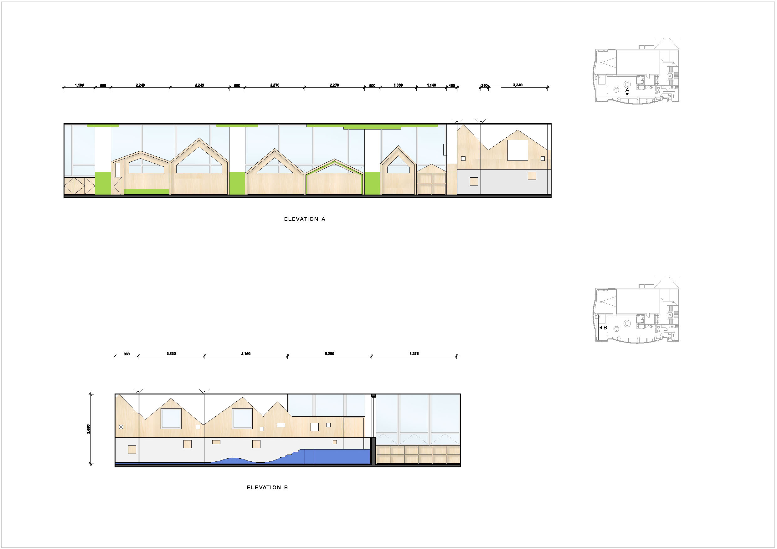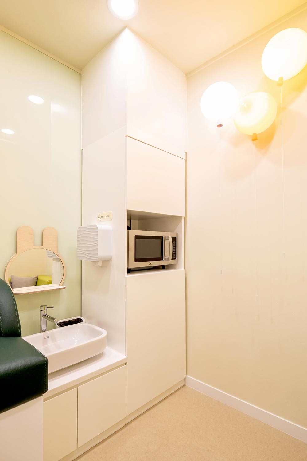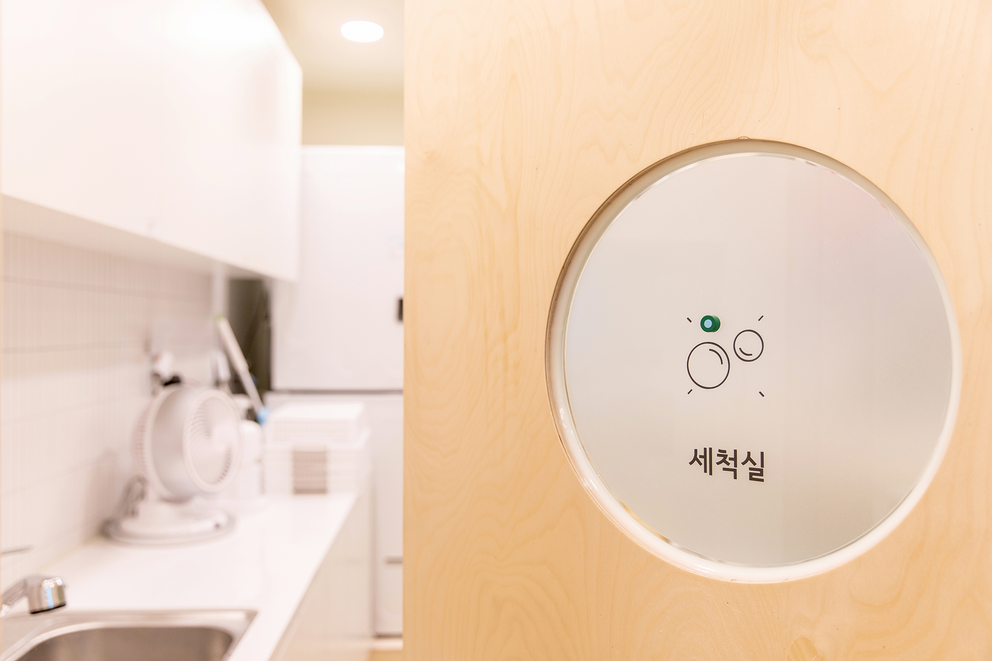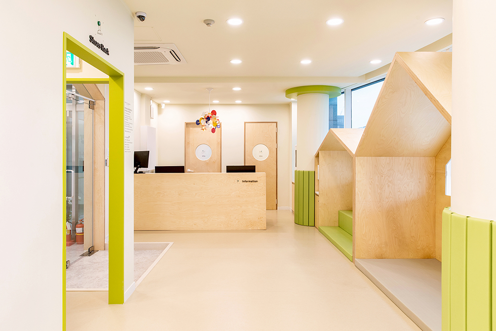 Imagine a scenery of the children playing, where there are trees around the playful children's houses and they can freely play among the trees. The columns between the houses portray trees, and circular structures that embody trees were also installed on the ceiling. The space also has a program room where independent programs can be run, a washing room where toys are washed and stores, a shoe cabinet, reception, meeting room and a nursing room. The overall atmosphere was created with the white color and wood of birch plywoods, and a bright green color and signs were used to highlight the space. The same was applied to the toy storage shelf that occupies the entire wall on one side, and for some of of the storage boxes, mats were installed to allow children to enter and play. We hope that it can become a public playground, where the playful children can play for as much as they want, as if playing comfortably at home rather than consuming a space.