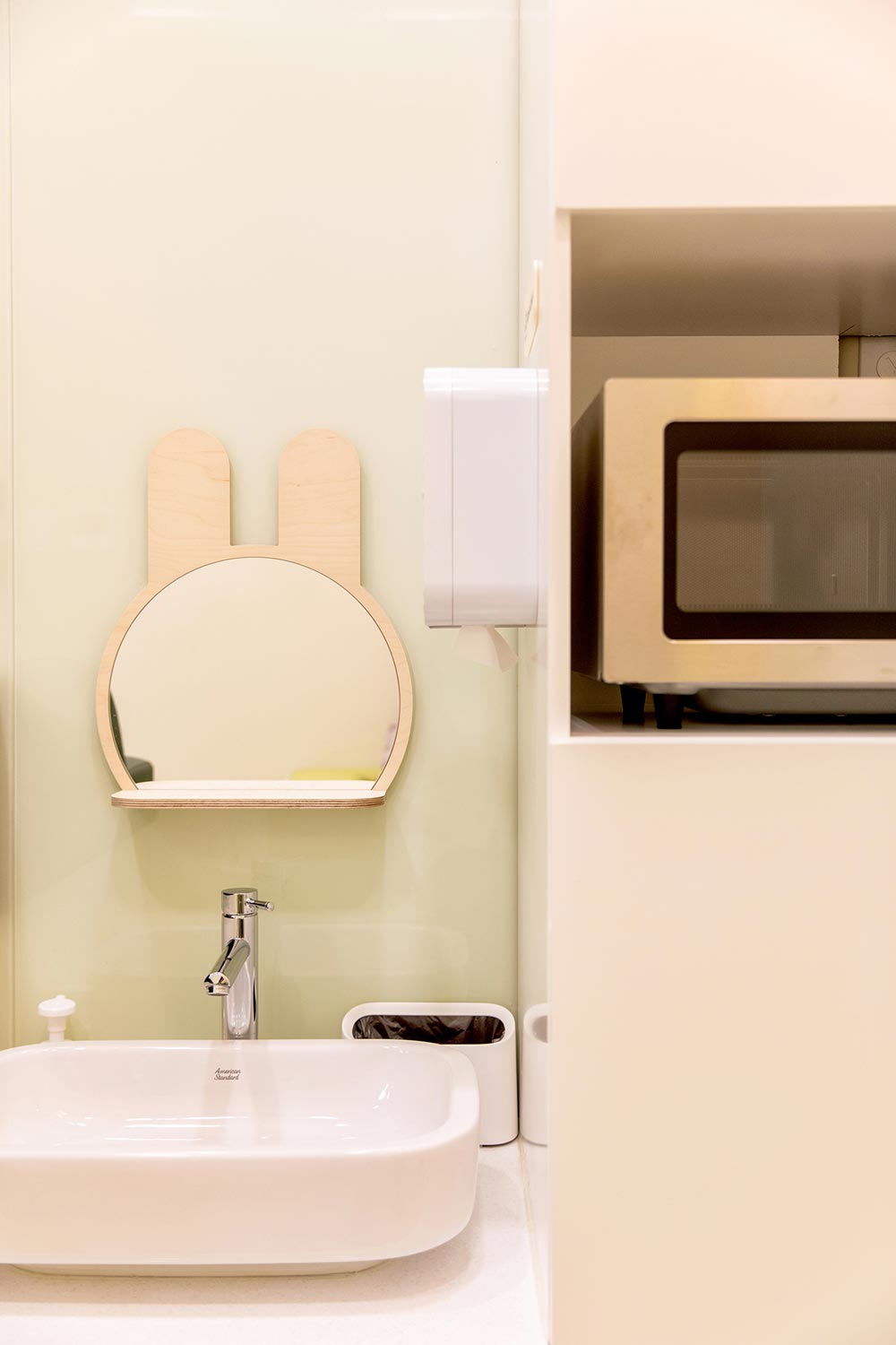 장난꾸러기들이 있는 집 주변에는 나무가 있고 그 나무들 사이에서 자유롭게 놀 수 있는 놀이 풍경을 상상해 본다., 집과 집 사이에 있는 기둥은 나무를 형상화하고 천정에도 나무를 형상화한 원형 구조물이 설치되었다. 독립적인 프로그램 운영이 가능한 프로그램실, 장난감을 세척하고 보관하는 세척실, 신발장, 리셉션, 회의실, 수유실로 구성되어 있다. 전체적으로 자작합판의 나무와 흰색으로 분위기를 만들고 밝은 그린컬러와 사인으로 포인트를 주었다. 이는 한쪽 벽면 전체를 차지하고 있는 장난감 수납함에도 마찬가지로 적용하고 수납함의 일부는 아이들이 들어가서 놀 수 있도록 매트를 설치했다. 이 곳에서 어린 아이들이 공간의 소비가 아닌 집에서 편안하게 놀 듯, 장난꾸러기가 맘껏 놀 수 있는 놀 수 있는 공공의 놀이터가 되길 바란다.